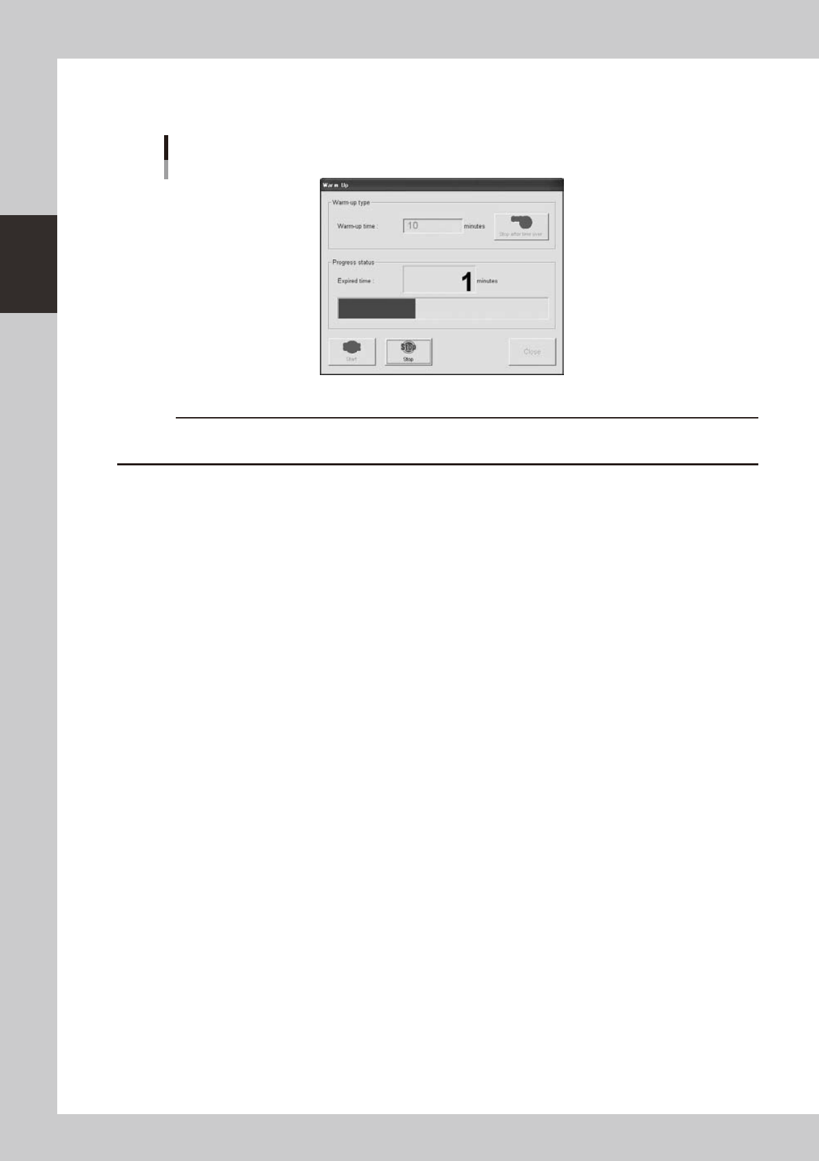 Warm-up will automatically stop when the warm-up time you set is reached. Press the [Close] button,