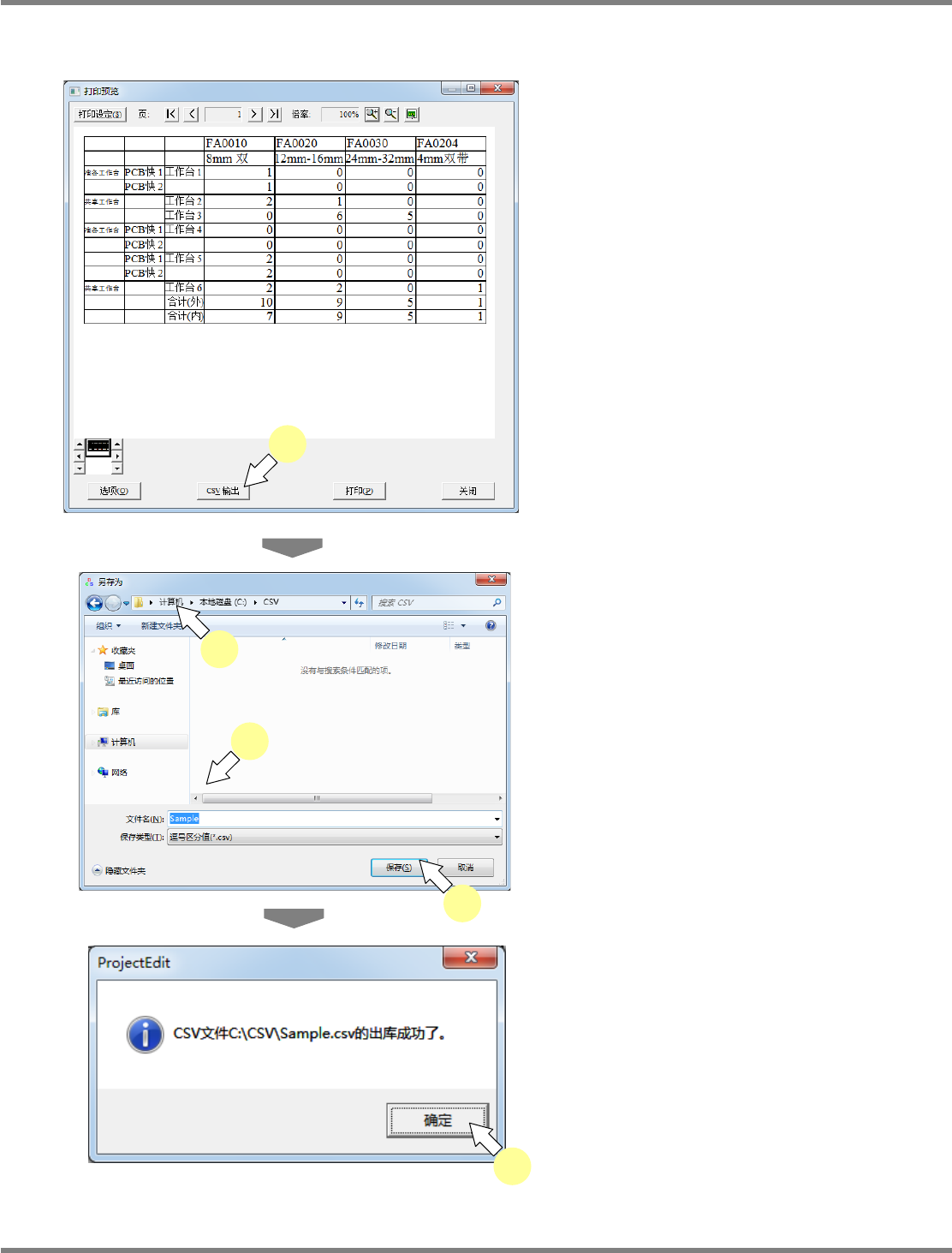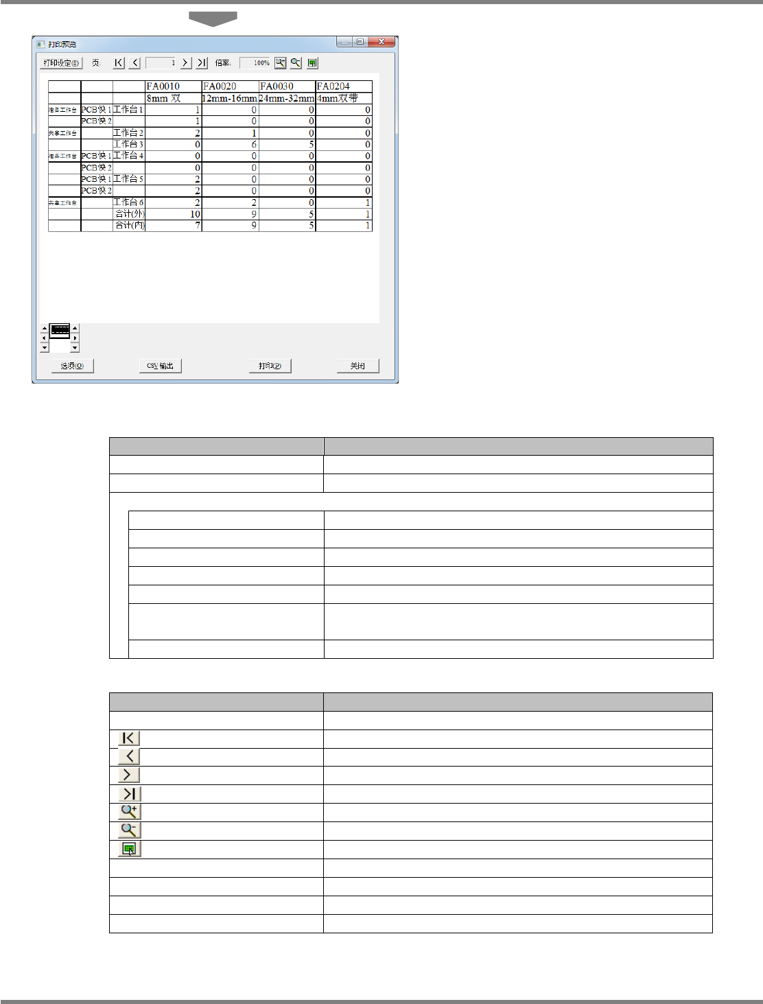 NPM-DGS 程序手册 7.2 项目编辑系统主画面 Page 7-78 EJS9AC-MB-07P-29 将显示 < 打印预览 > 画面。 显示项目 项目 说明 ‘ 页 ’ 显示帐票的页码。 ‘ 倍率 ’ 显示打印预览的显示倍率。 ‘ 供料器数信息 ’ ‘ 准备工作台 ’ 表示工作台属于准备工作台。 ‘ 共享工作台 ’ 表示工作台属于通常使用的工作台。 ‘PCB 组 ’ 显示 PCB 组编号。 ‘ 工作台 ’ 显示…