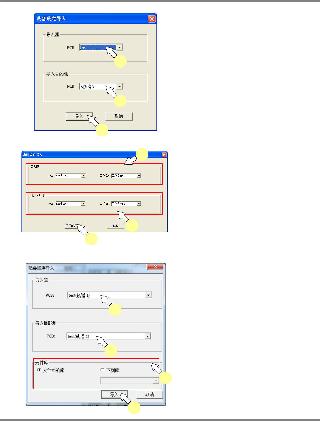 NPM-DGS 程序手册 7.2 项目编辑系统主画面 EJS9AC-MB-07P-29 Page 7-89 设备设定导入 1 指定导入源的 PCB 。 2 指定导入目的地的 PCB 。 3 点击 [ 导入 ] 。 点胶条件导入 1 指定点胶源 PCB 、工作台。 2 指定导入目的地 PCB 、工作台。 3 点击 [ 导入 ] 。 贴装顺序导入 1 指定导入源的 PCB 。 2 指定导入目的地的 PCB 。 3 选择元件库。 …