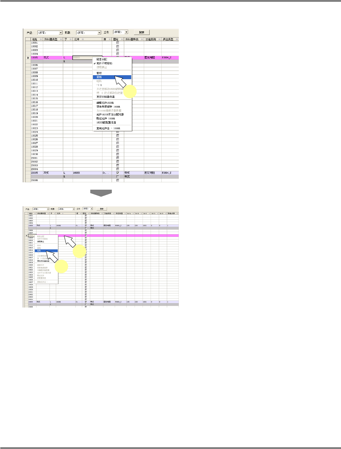 NPM-DGS 程序手册 7.6 供料器表画面 Page 7-148 EJS9AC-MB-07P-29 复数元件的剪切 / 复制 / 粘贴 1 选择多个执行剪切 / 复制的元件。 在多个范围内选择时,先选择最上一 行的元件 后,再按 [Shift] 键的同时按最后一行的元件。 需要个别选择时,一边按 [Ctrl] 键一边选择。 2 在所选元件上右击弹出菜单,点击 [ 剪 切 ] 或者 [ 复制 ] 。 剪切或者复制复数元件。…