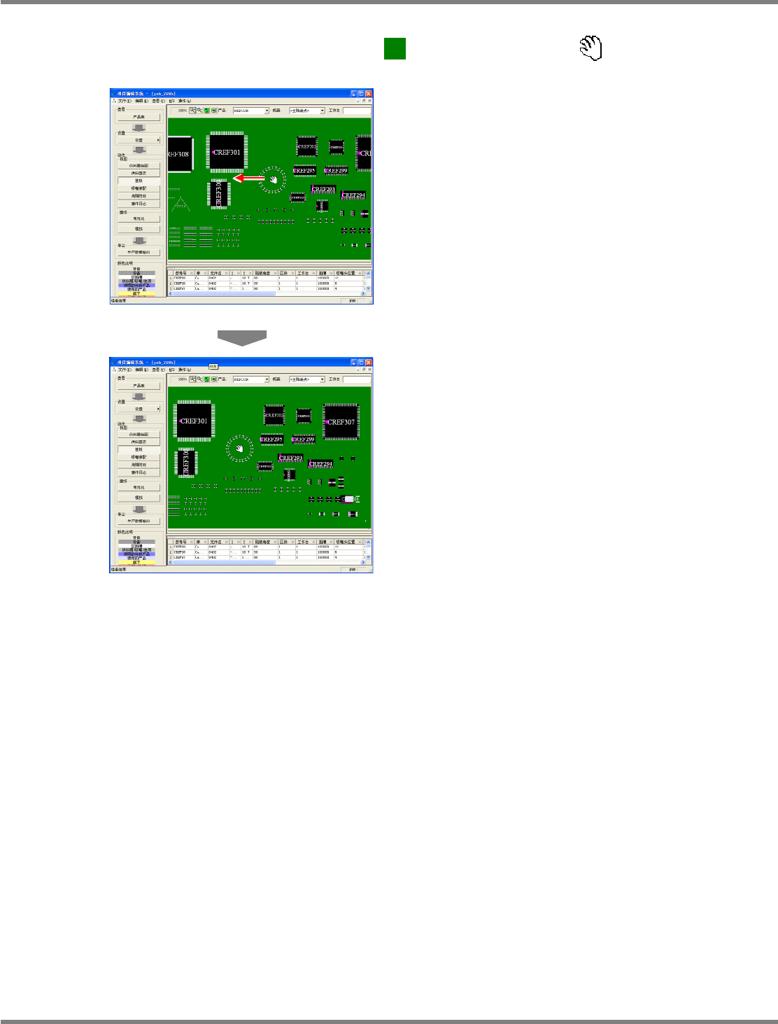 NPM-DGS 程序手册 7.7 基板画面 Page 7-156 EJS9AC-MB-07P-29 左单击 在扩大显示基板的状态下,左单击基 板上的 后等候片刻,光标会转为 。在这个状态 下移动光标,相应地基板图也会移动 。 向左移动光标。 基板图也会向左移动。 Product070600S- 03C01 Product070600S- 02C01