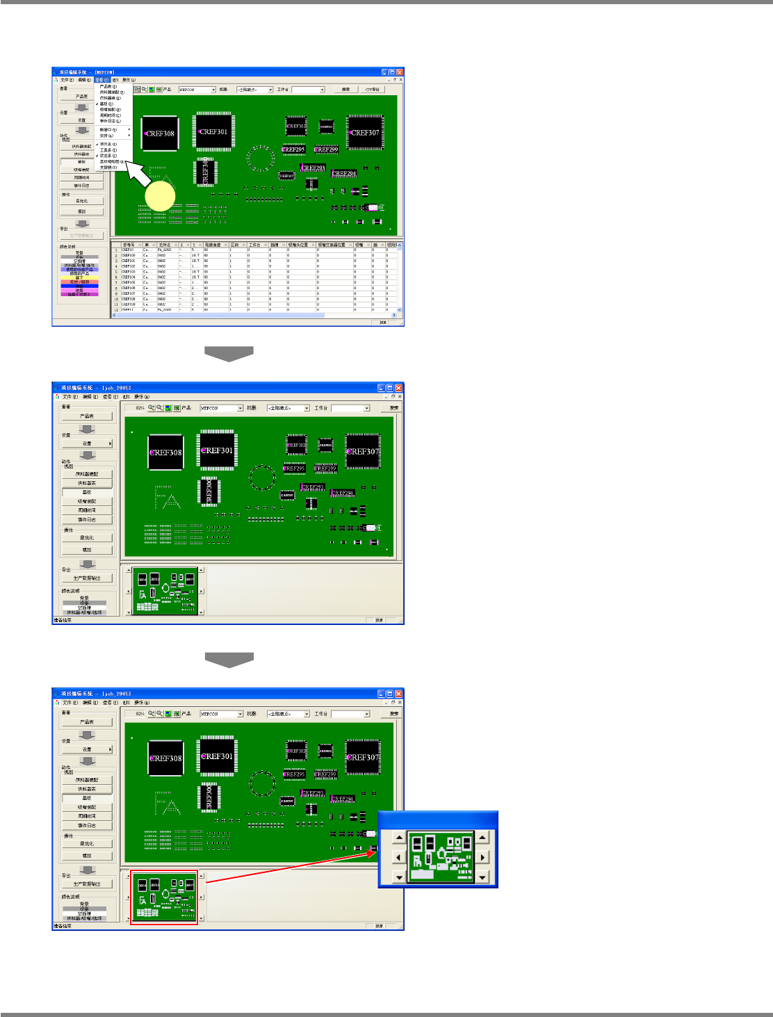 NPM-DGS 程序手册 7.7 基板画面 EJS9AC-MB-07P-29 Page 7-173 7.7.8 缩略图的显示 能够显示基板缩略图。 1 选择菜单栏的 [ 显示 ] [ 基板缩略图 ] 。 显示出 < 基板缩略图 > 画面。 在点击 < 基板缩略图 > 画面的状态下拖拉,画面 即会被分离出来,并能够自由配置。 双击 < 基板缩略图 > 画面,也能够分离画面。 Produc…