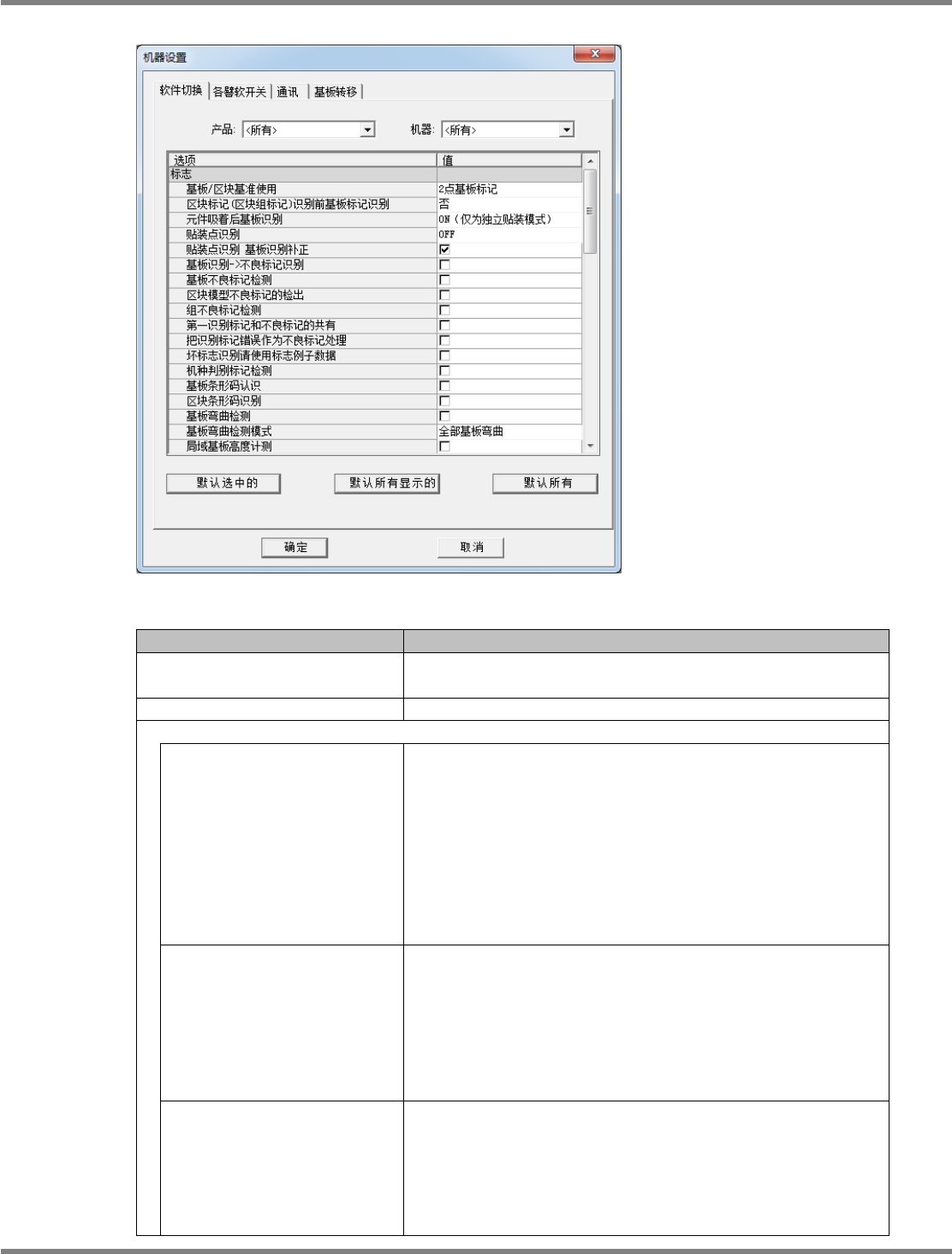 NPM-DGS 程序手册 7.11 各种设定 EJS9AC-MB-07P-29 Page 7-197 项目 说明 ‘ 标志 ’ ‘ 贴装点识别 ’ 设定是否检测贴装点识别的检测时机 。 ‘ 贴装点识别 基板识别补正 ’ 当贴装点识别标记位置偏移贴装位置 时,需要考虑基板的倾斜。 在这种情形下, 设定是否将基板识别补正值反映进贴装 点的补正。 ‘ 基板识别 -> 不良标记识别 ’ 设定标志的识别顺序。有以下 2 种。 • [OFF]…