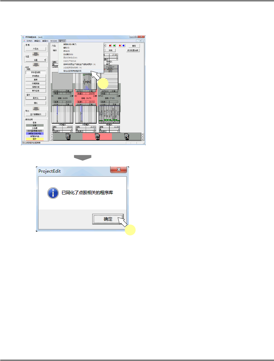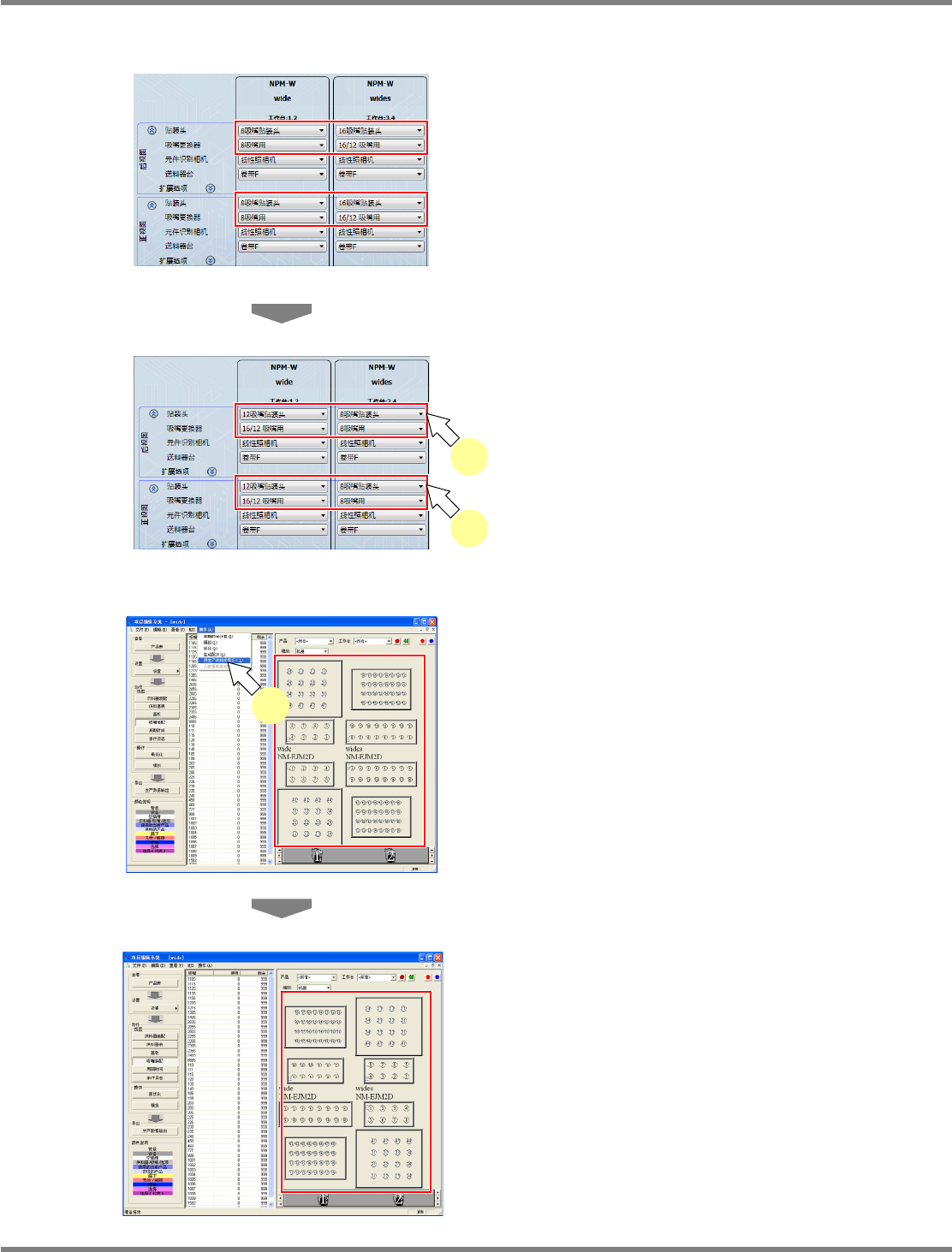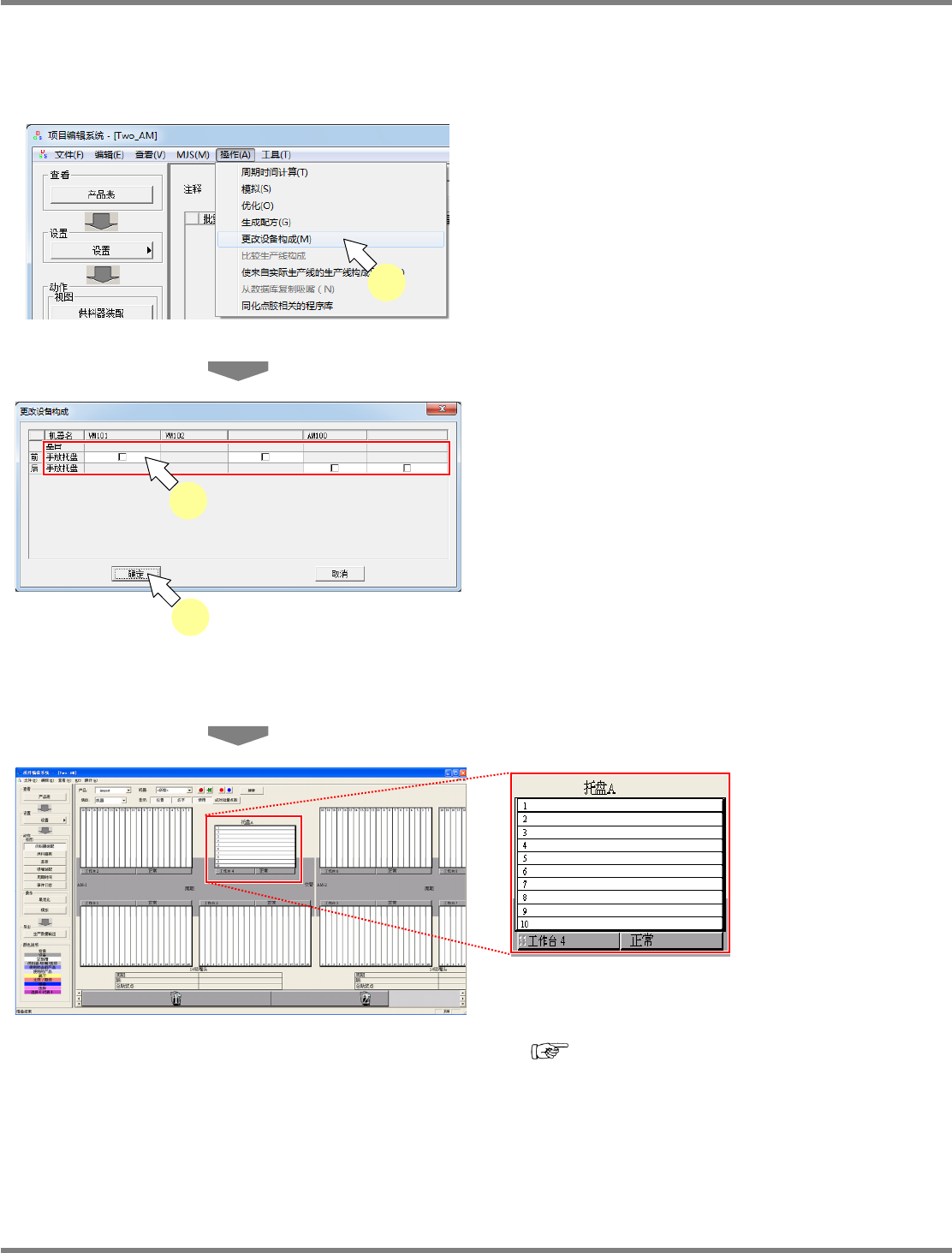 NPM-DGS 程序手册 7.12 生成数据 Page 7-228 EJS9AC-MB-07P-29 7.12.6 设备构成的变更 变更生产数据中的设备构成。 在项目编辑系统,只进行 AM100/VM101/VM102 的手动托盘的设定。 1 选择菜单栏的 [ 操作 ] [ 更改设备构 成 ] 。 显示 < 更改设备构成 > 画面。 只限生产线构成有 AM100 时可以选择。 2 在设定手动托盘的设备的打勾箱打勾…