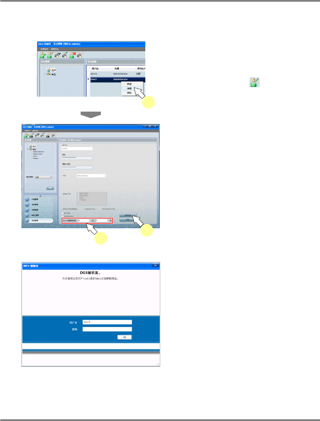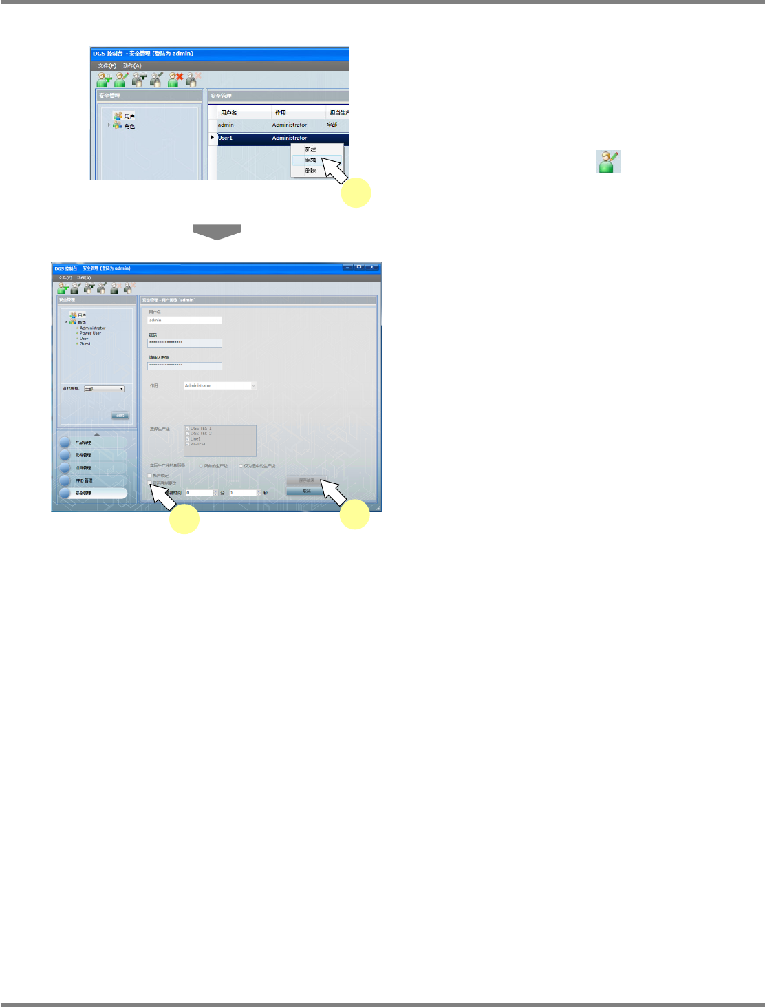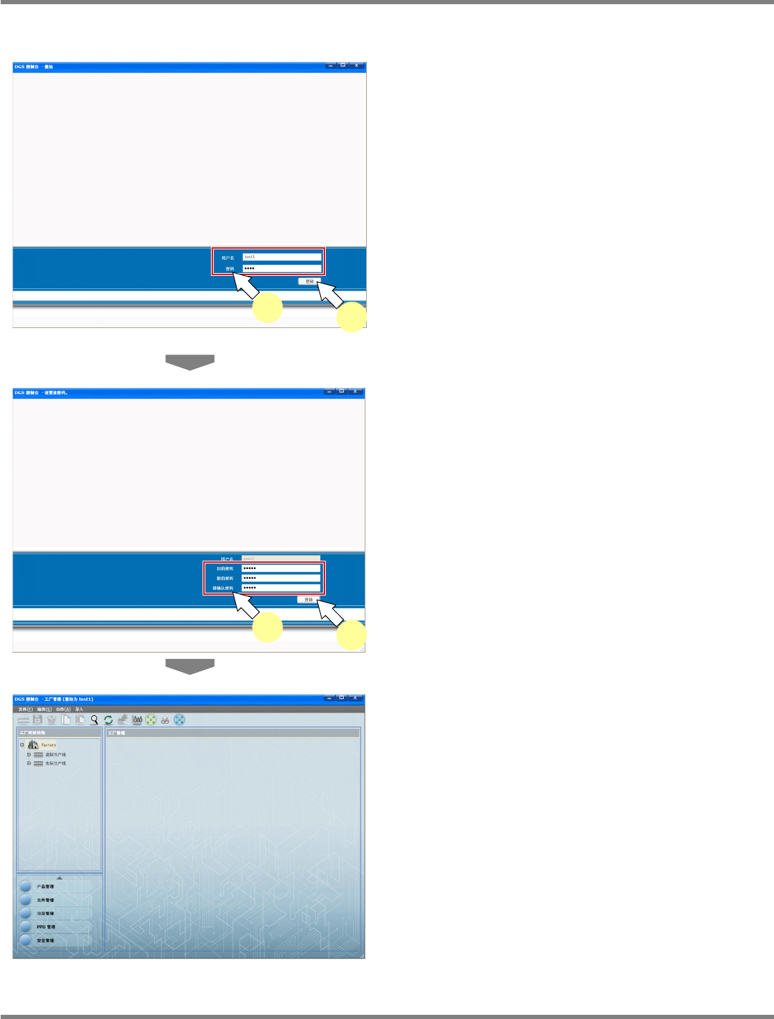 NPM-DGS 程序手册 8.1 许可证管理 Page 8-18 EJS9AC-MB-08P-11 密码更改步骤 1 输入 ‘ 用户名 ’ 、 ‘ 密码 ’ 后,点击 [ 登陆 ] 。 登录后,将显示密码更改画面。 2 输入 ‘ 旧的密码 ’ 、 ‘ 新的密码 ’ 、 ‘ 请确认密 码 ’ 。 新密码需要满足以下的条件 : ・ 8 个字符以上 ( 不足 30 个字符 ) ・ 包含英文大写和小写字母 ・ 包含数字 3 点击 […
