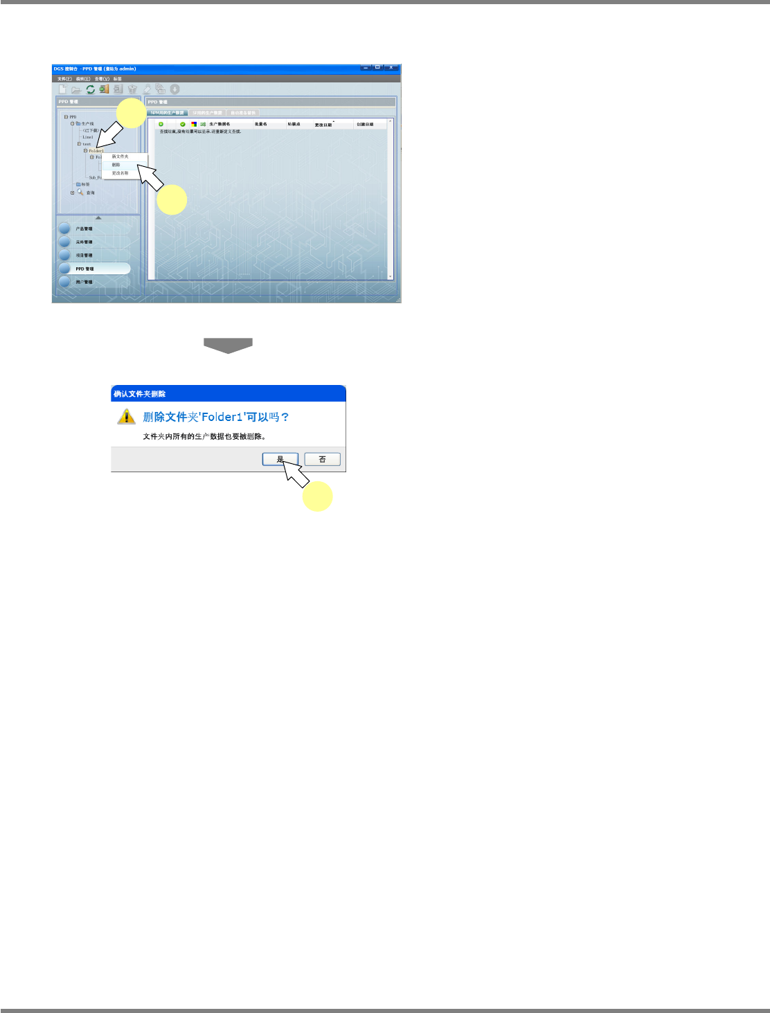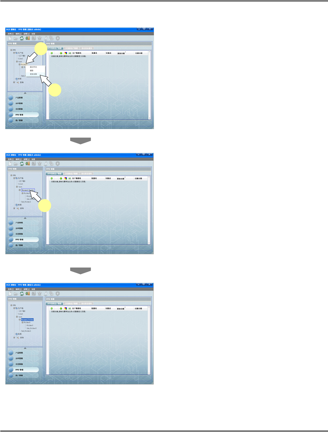 NPM-DGS 程序手册 9.2 关于 PPD 管理画面 Page 9-8 EJS9AC-MB-09P-20 9.2.3 变更文件夹名称 1 选择需要变更名称的文件夹。 2 选择右击菜单的 [ 变更名称 ] ,或者双 击文件夹。 文件夹将会被篮框围住。 3 输入新的文件夹名称。 最多可以输入 64 个文字 ( 以下特殊文字除外 ) % , ” 空格 \ : ; / . < > ? * | 全角文字 不可在相同…