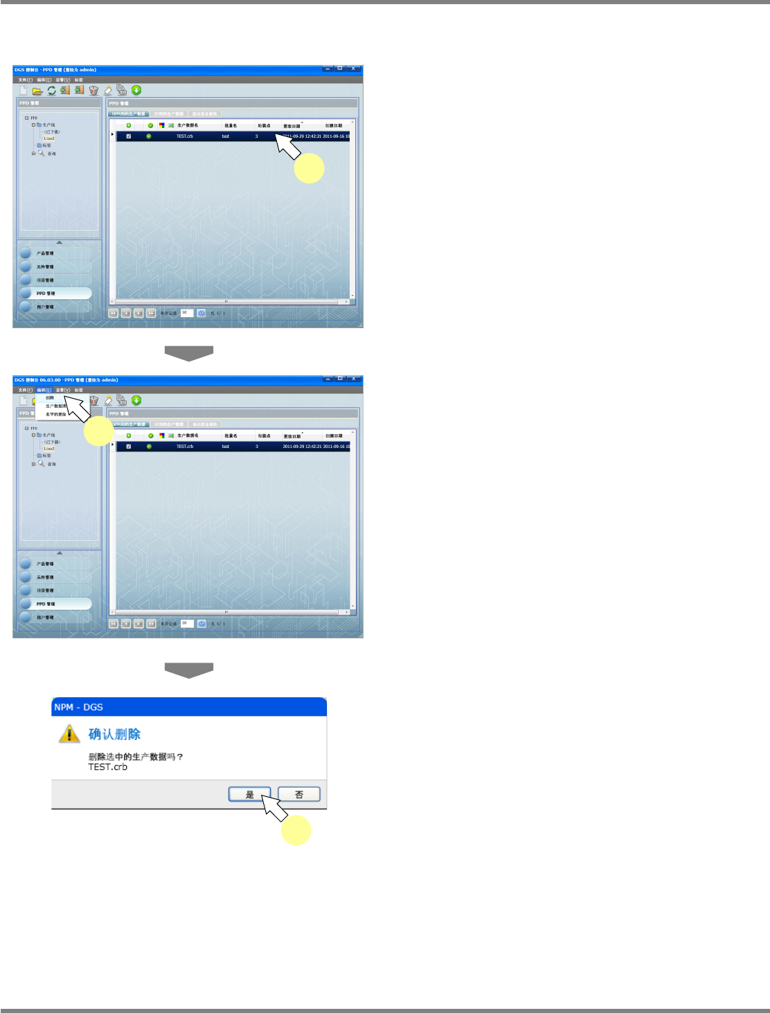NPM-DGS 程序手册 9.2 关于 PPD 管理画面 EJS9AC-MB-09P-20 Page 9-13 9.2.7 变更生产数据的名称 1 选择变更名称的生产数据。 2 在选择的生产数据上右击, 从右击菜单 中选择 [ 重命名 ] 。 显示出 < 生产数据名更改 > 画面。 3 输入新的名称。 4 点击 [ 确定 ] 。 即会变更生产数据名。 PPD0903013S-0 4C02 2 1 PPD090301S…