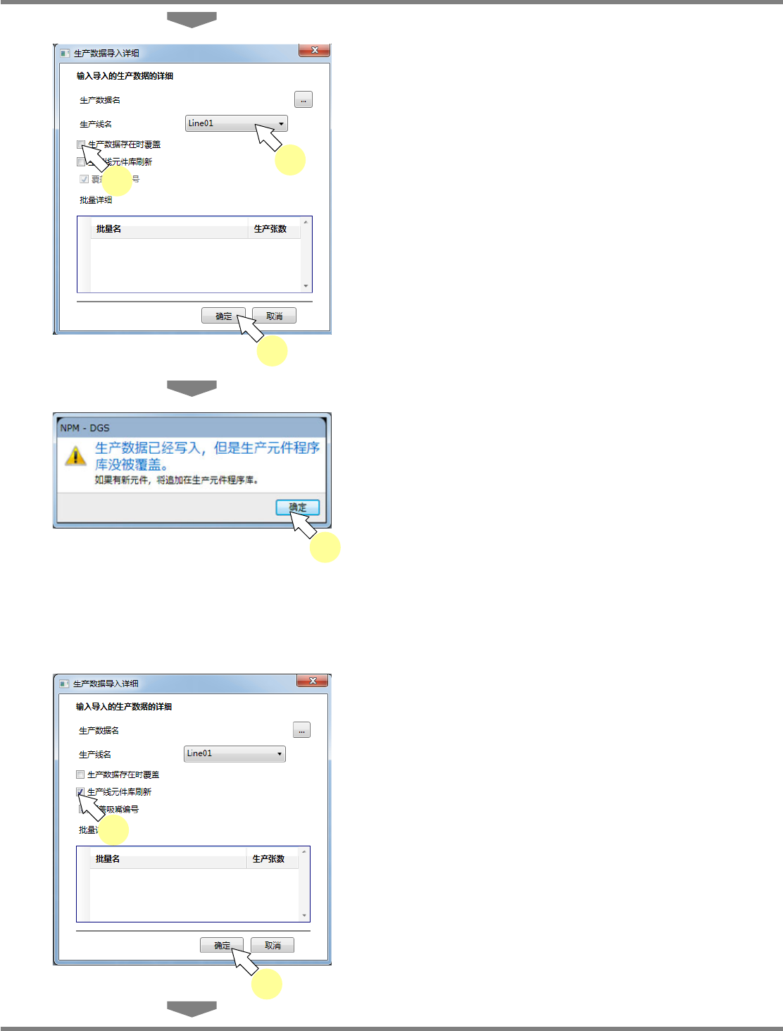 NPM-DGS 程序手册 9.3 生产数据的操作 EJS9AC-MB-09P-20 Page 9-25 9.3.2 生产数据的导入 1 选择菜单栏的 [ 文件 ] [ 导入 ] ,或者点 击工具栏的 , 或者选择右击菜单的 [ 向 PPD 导入生产数据 ] 。 显示出 < 生产数据导入详细 > 画面。 2 点击生产数据名的 。 显示出文件选择画面。 如果在以前实施过导入,那么则会显 示上一次 的生产线名、导入…