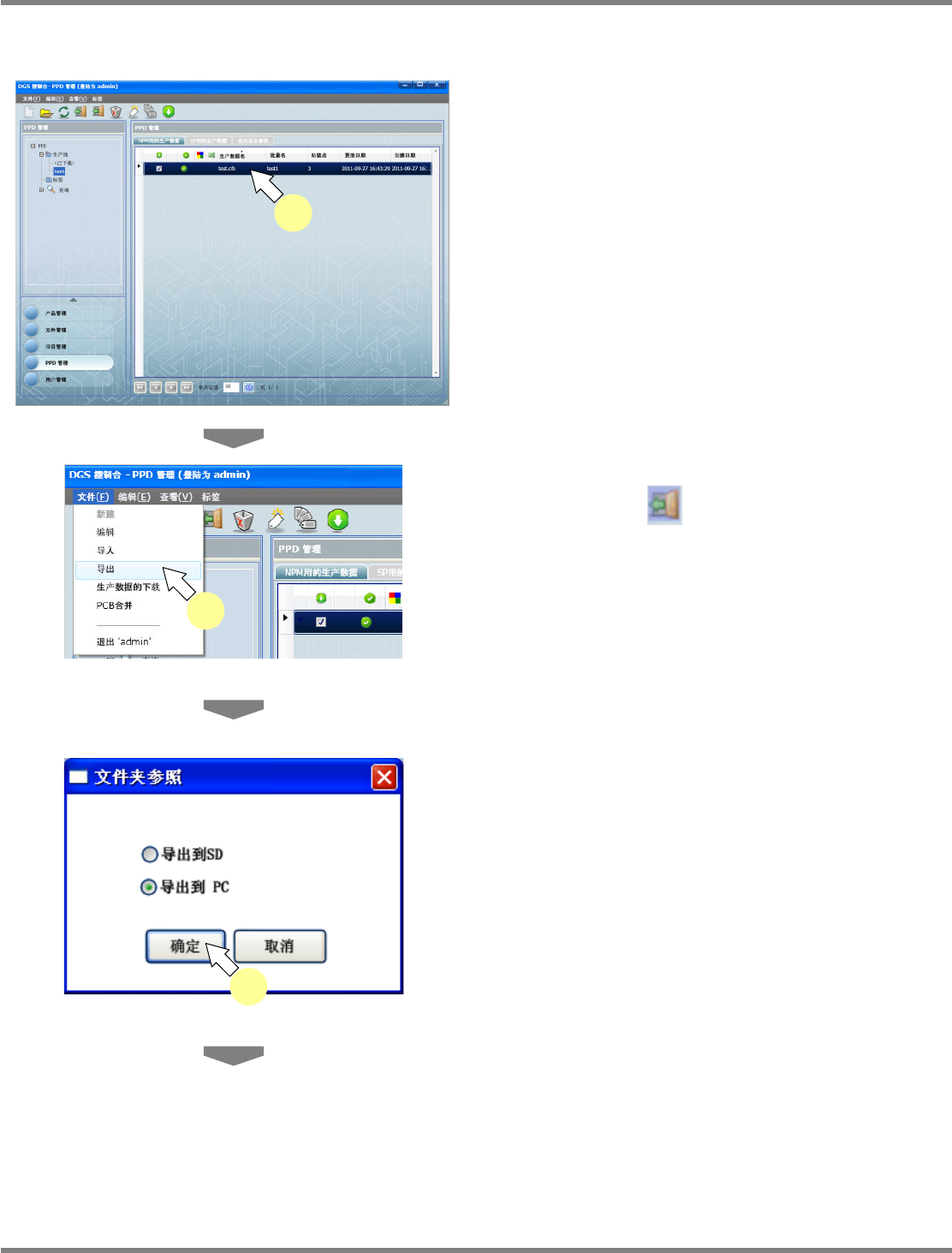 NPM-DGS 程序手册 9.3 生产数据的操作 EJS9AC-MB-09P-20 Page 9-31 4 选择要保存的文件夹,点击 [ 确定 ] 。 显示出 < 导出成功了。 > 画面。 5 点击 [ 确定 ] 。 PPD090404S-06C 01 PPD090404S-05C 01 4 5