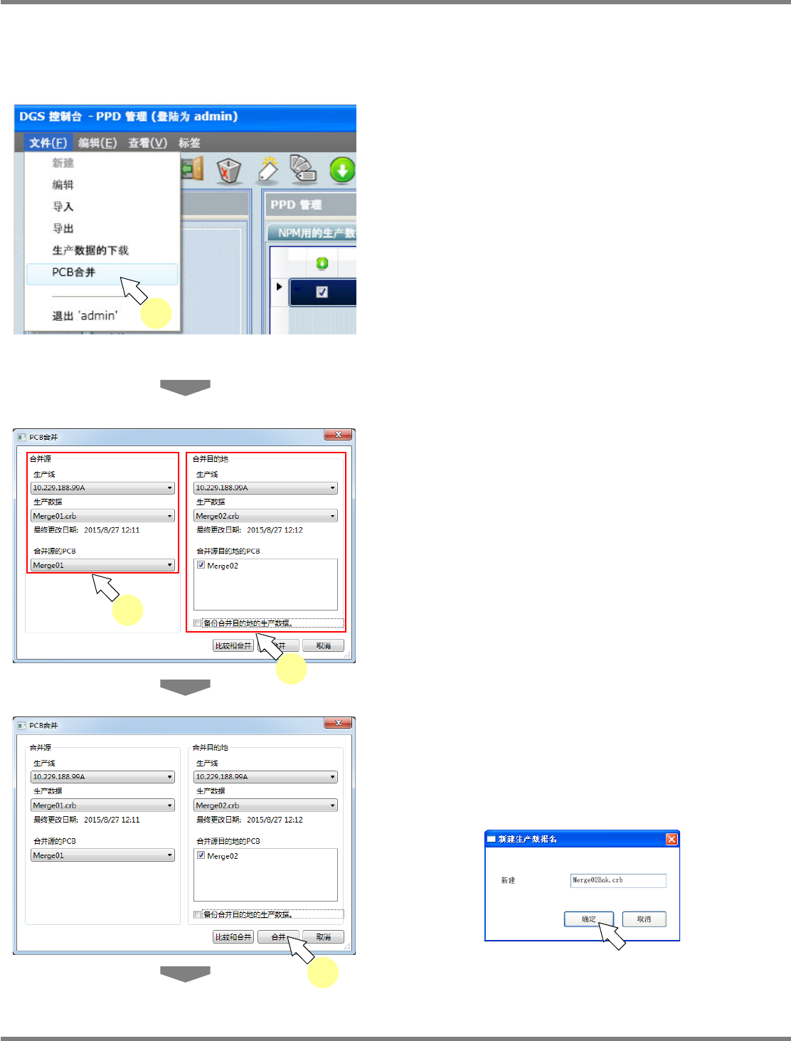 NPM-DGS 程序手册 9.3 生产数据的操作 EJS9AC-MB-09P-20 Page 9-35 5 点击 [ 是 ] 。 6 点击 [ 确定 ] 。 合并源的坐标 (X 、 Y 、角度 ) 即会被复制进合并 目的地数据内。 PPD090304S-06C 02 6 PPD090304S-05C 01 5