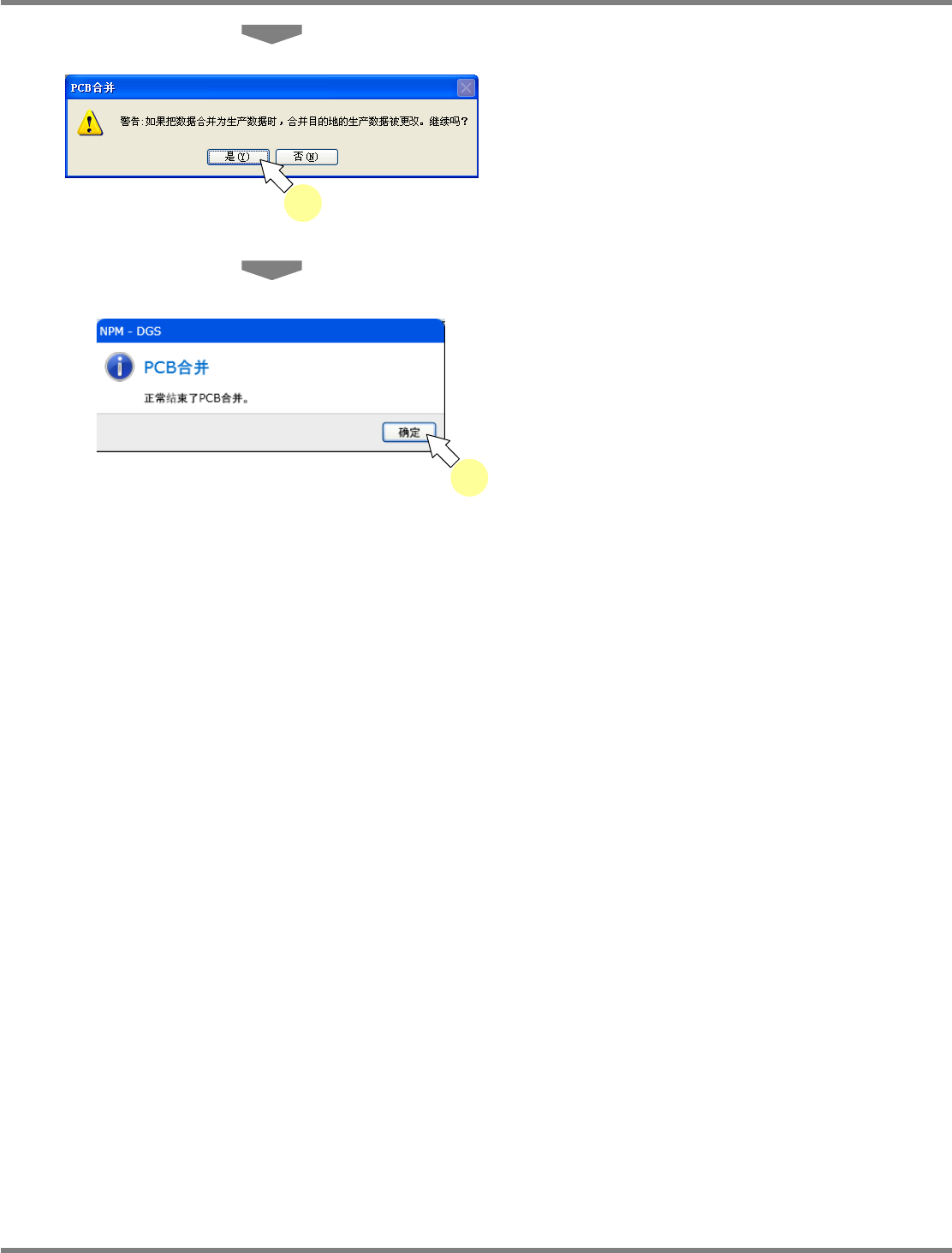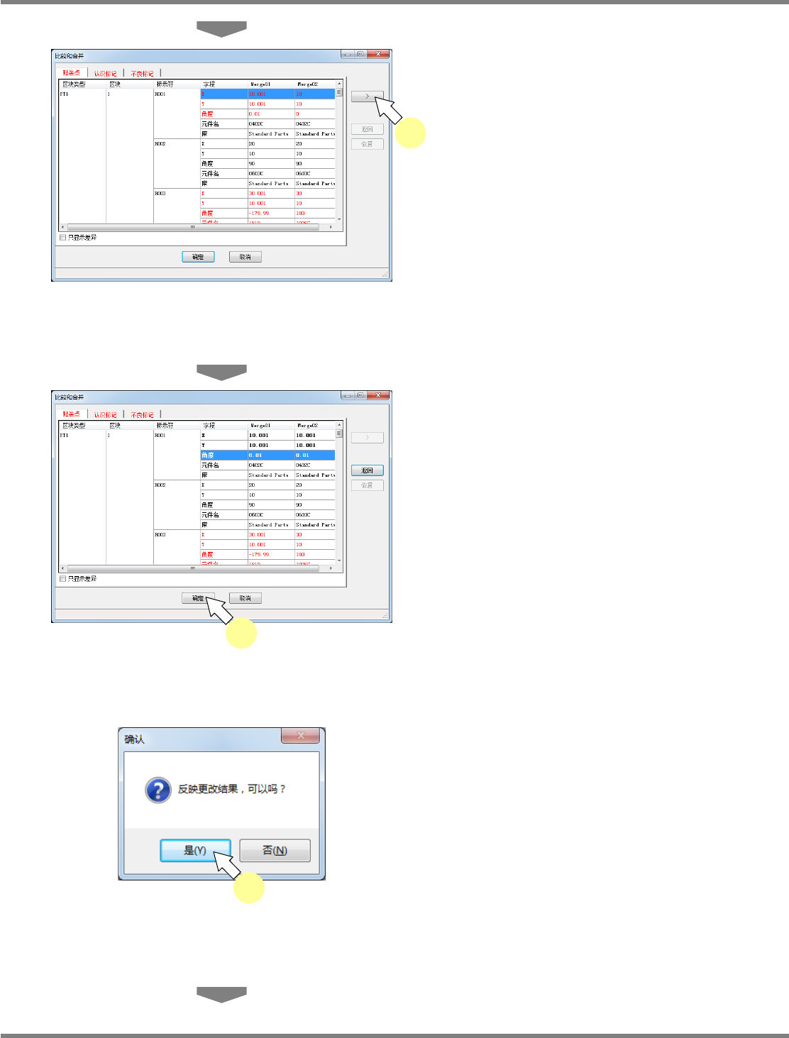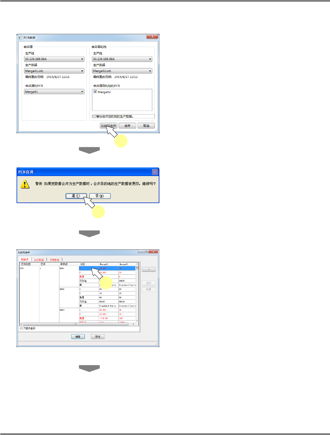 NPM-DGS 程序手册 9.3 生产数据的操作 Page 9-36 EJS9AC-MB-09P-20 比较和合并 对每个贴装点都进行比较,然后只对 从比较结果中选择的差异执 行合并时,进行如下所示的 操作。 除了贴装点,还可比较或合并基板标 记、区块标记、典型的不良 标记、区块不良标记。 1 点击 [ 比较和合并 ] 。 2 点击 [ 是 ] 。 显示 < 比较和合并 > 画面。 当生产数据属于对不同的贴装点定…