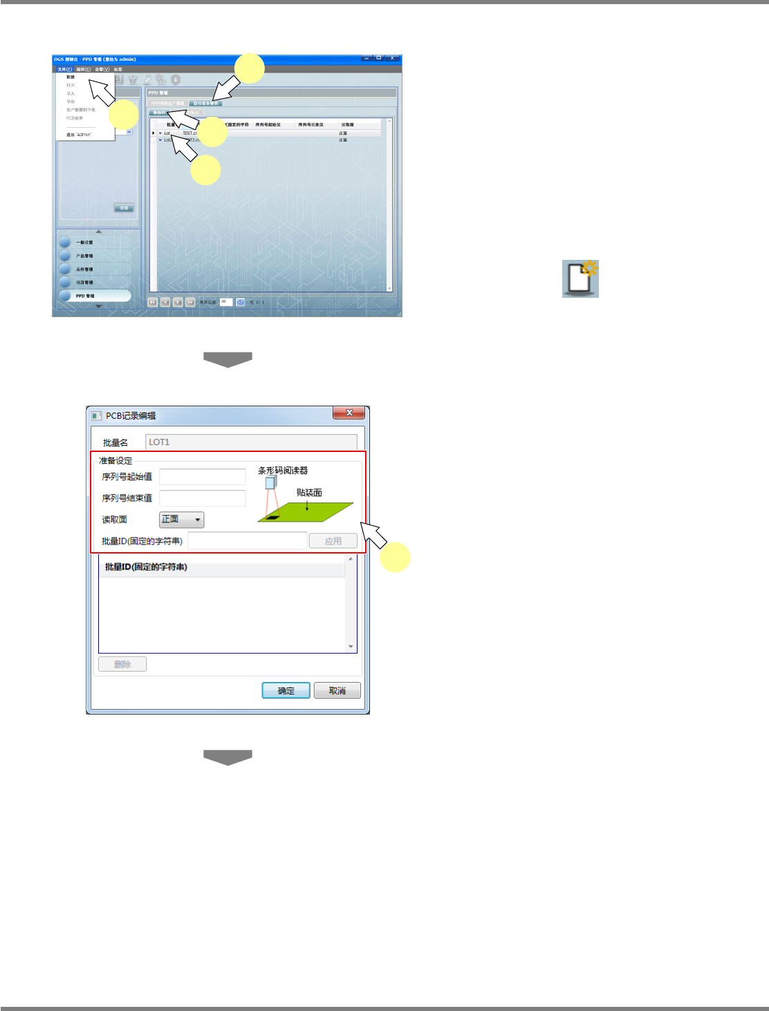 NPM-DGS 程序手册 9.3 生产数据的操作 EJS9AC-MB-09P-20 Page 9-49 新添加条形码信息 1 点击 [ 自动准备替换 ] 标签。 2 点击 [ 条形码 ] 标签。 3 从一览表中选择追加 PCB 代码的生产 数据。 4 选择菜单栏的 [ 文件 ] [ 新建 ] ,或者点 击工具栏的 ( 新建 ) , 或者在右击 菜单中选择 [ 新建 ] 。 显示出 <PCB 记录编辑 > 画面。 …