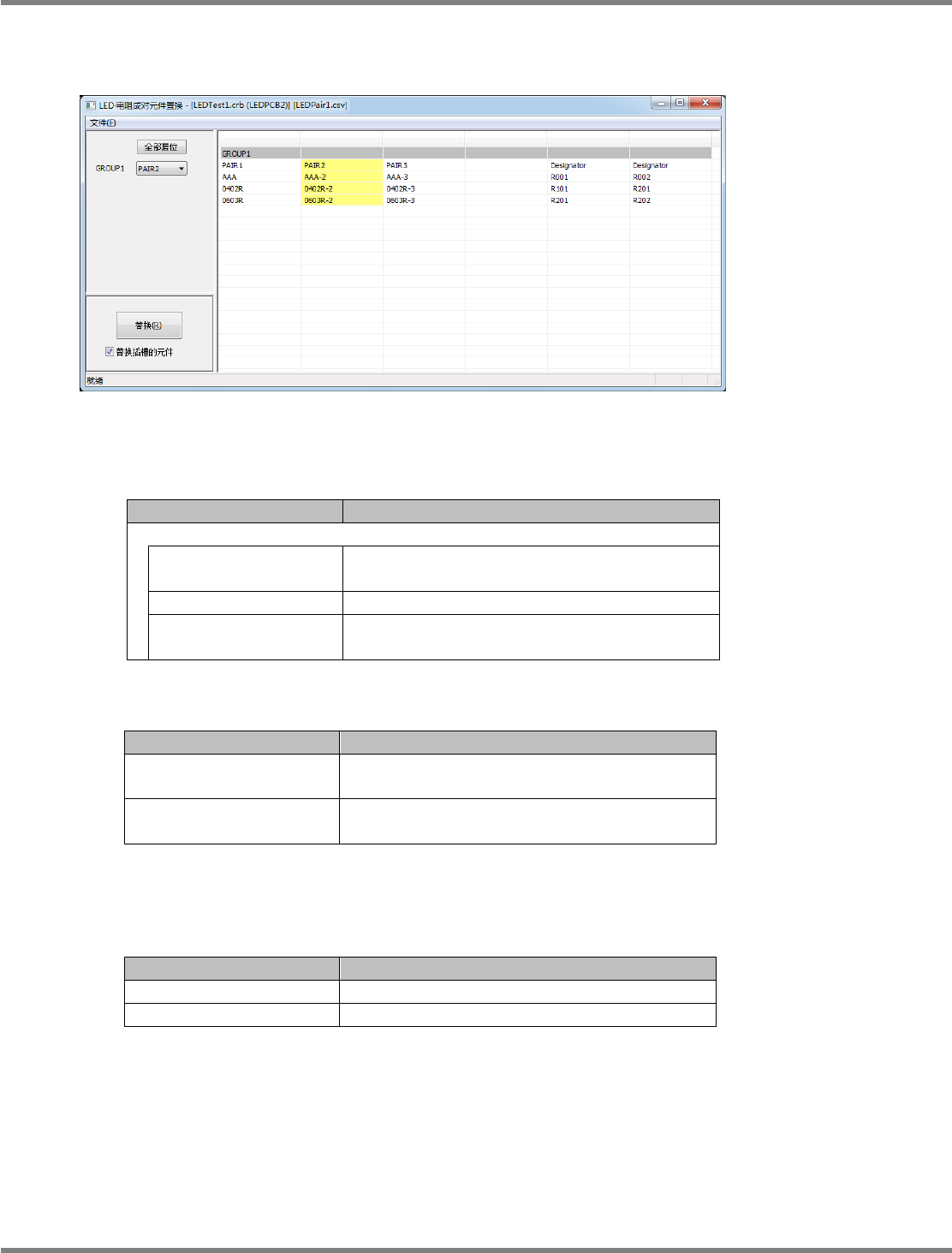 NPM-DGS 程序手册 9.3 生产数据的操作 Page 9-88 EJS9AC-MB-09P-20 LED ・ 电子成对元件的置换画面 菜单 项目 说明 [ 文件 ] [ 打开 ] 可打开 PPD 生产数据 /LED 成对后,再次选 择文件。 [ 置换 ] 执行置换元件的操作。 [ 结束 ] 结束 LED ・ 电阻成对元件的置换后,关闭对 话框。 LED ・ 电阻成对元件置换的设定项目 按钮 项目 说明 [GROUP…
