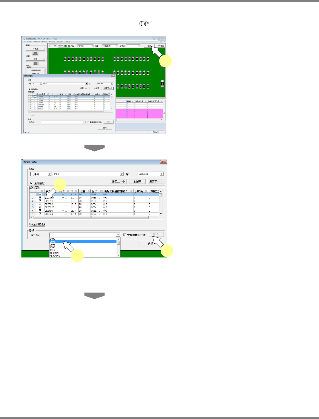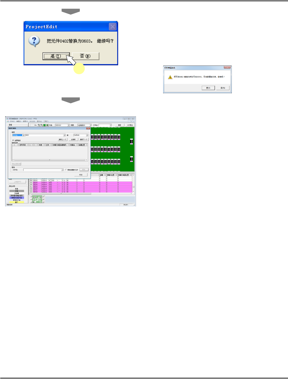 NPM-DGS 程序手册 9.4 关于项目编辑系统画面 Page 9-116 EJS9AC-MB-09P-20 5 点击 [ 是 ] 。 当选择了所选元件库内的元件时,将 显示左侧 画面。 输入元件名后替换时,将显示下述画 面。 将会在基板信息上显示替换后的元件 。 PPD090505S-08C 03 PPD090505S-09C 00 5 PPD090505S-10C 00
