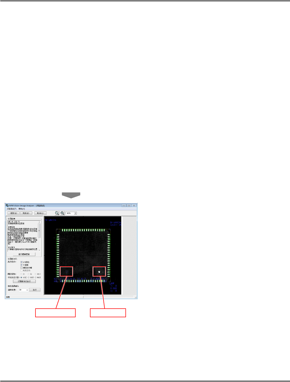 NPM-DGS 程序手册 11.4 用扫描设备制作识别选项数据的详情 EJS9AC-MB-11P-09 Page 11-25 11.4.13 识别测试 在本操作画面上,使用设备识别软件 的模拟程序来确认在前工序 所编制的识别数据是否妥当 。 1 确认识别测试的结果。 打开画面后, 识别模拟程序会自动启动, 并执行 识别测试。 识别测试的结果显示在 a ) 上。 发生错 误时,同时还会在画面上显示说明。 b ) 如果在识别测试发生了错误,…