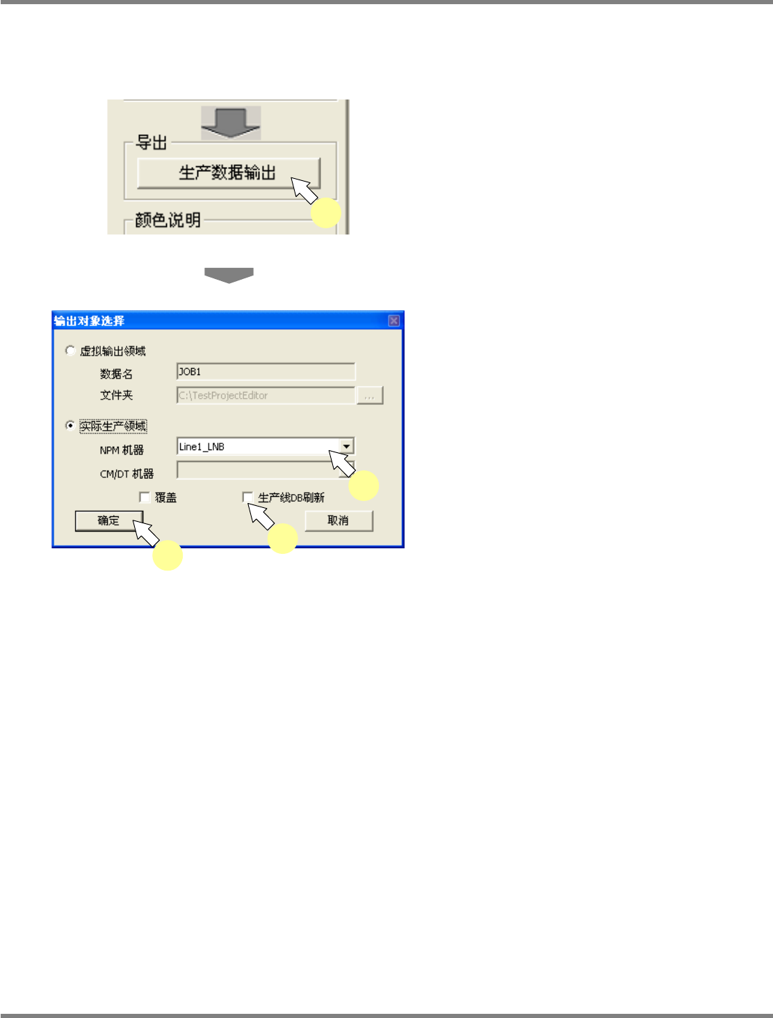NPM-DGS 程序手册 12.2 运用例 EJS9AC-MB-12P-03 Page 12-7 将生产线元件库的元件数据反映进生产线元件数据。 通常,从数据编制编辑器输出生产数 据时,元件数据使用输出源 的生产线元件库数据。使用 主元件库的元 件数据时,需要在输出时执行覆盖更 新操作。 1 打开编制数据的编辑器。 2 点击 [ 生产数据输出 ] 。 将显示 < 输出对象选择 > 画面。 3 选择输出目的地的生产线。…