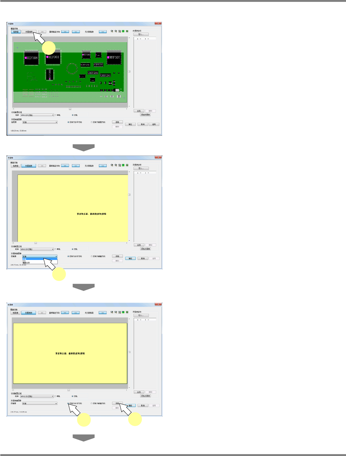 NPM-DGS 程序手册 13.2 支撑销配置数据的编制功能 Page 13-30 EJS9AC-MB-13P-24 ① 反面图像的读取 1 点击切换画面的 [ 支撑销侧 ] 。 不存在支撑销侧图像的基板,将在基 板画面上 显示支撑销侧的读取指南。 2 通过信息源的下拉菜单选择反面。 3 选择反转方向。 反转方向有水平方向与垂直方向的两 种。 4 点击 [ 读取 ] 。 Howto130205S-0 6C01 1 Howto13…