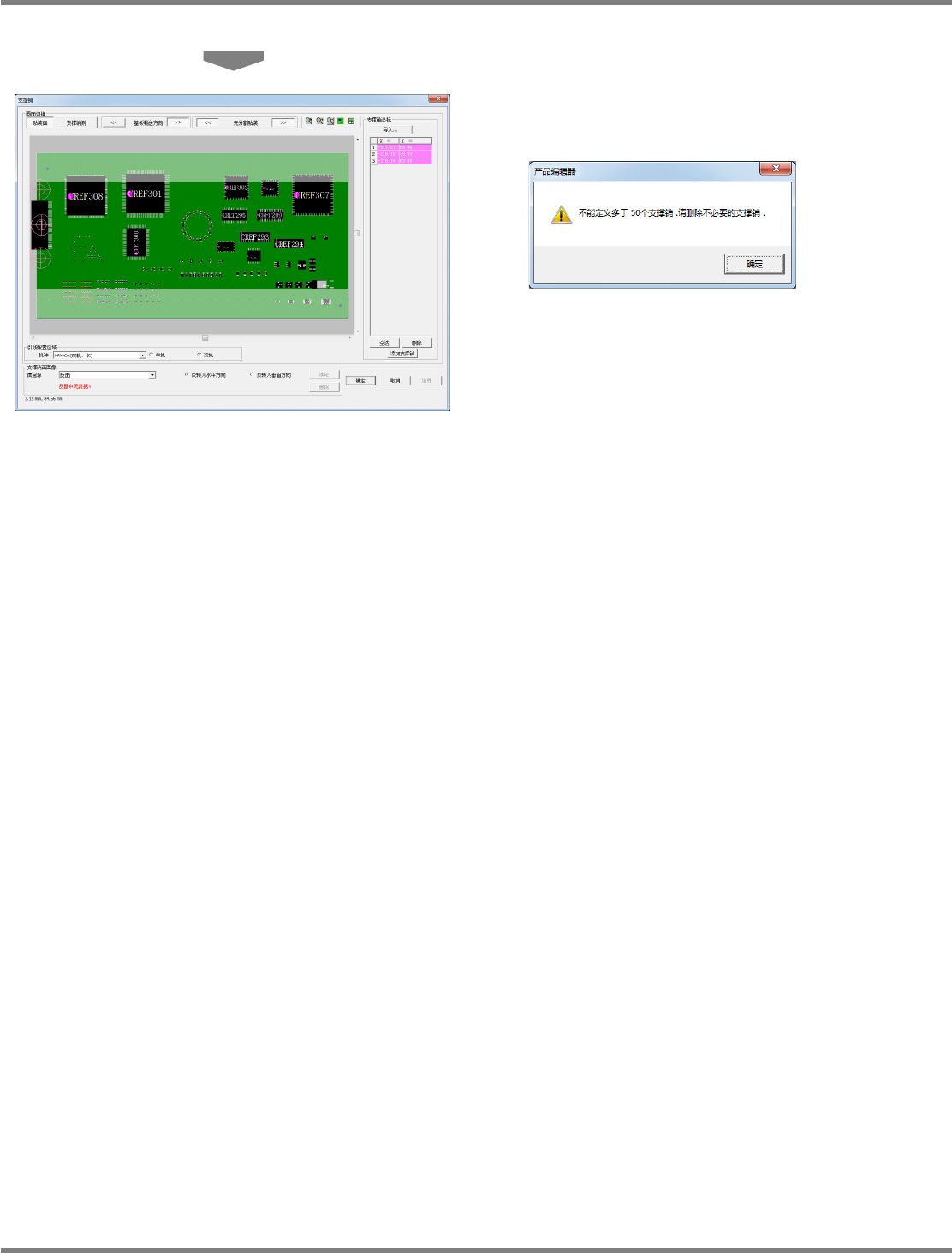 NPM-DGS 程序手册 13.2 支撑销配置数据的编制功能 Page 13-36 EJS9AC-MB-13P-24 向 PCB 添加贴装点时, 将对支撑销的数据进行 确认。发生错误时,将显示如下所示 的错误对 话框后,启动支撑销画面。 在 PCB 中设定了支撑销。 Howto130205S-1 2C00 Howto130205S-1 1J00