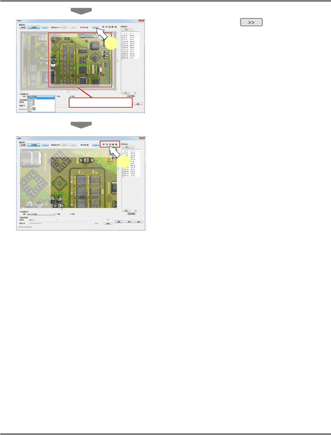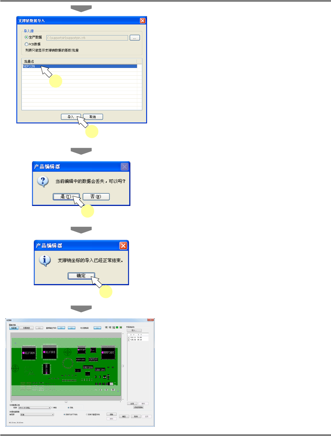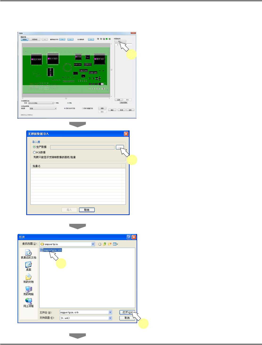NPM-DGS 程序手册 13.2 支撑销配置数据的编制功能 EJS9AC-MB-13P-24 Page 13-55 支撑销的导入 导入支撑销的方法有两种 : 从生产数据的导入与从 PCB 数据的导入。 ① 从生产数据的导入 1 点击支撑销坐标上的 [ 导入 ] 。 显示出 < 支撑销数据导入 > 画面。 2 点击 [ ・・・ ] 。 显示出 < 打开 > 画面。 3 选择拥有支撑销数据的生产数据。 …