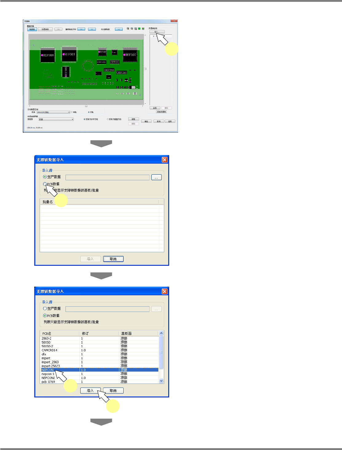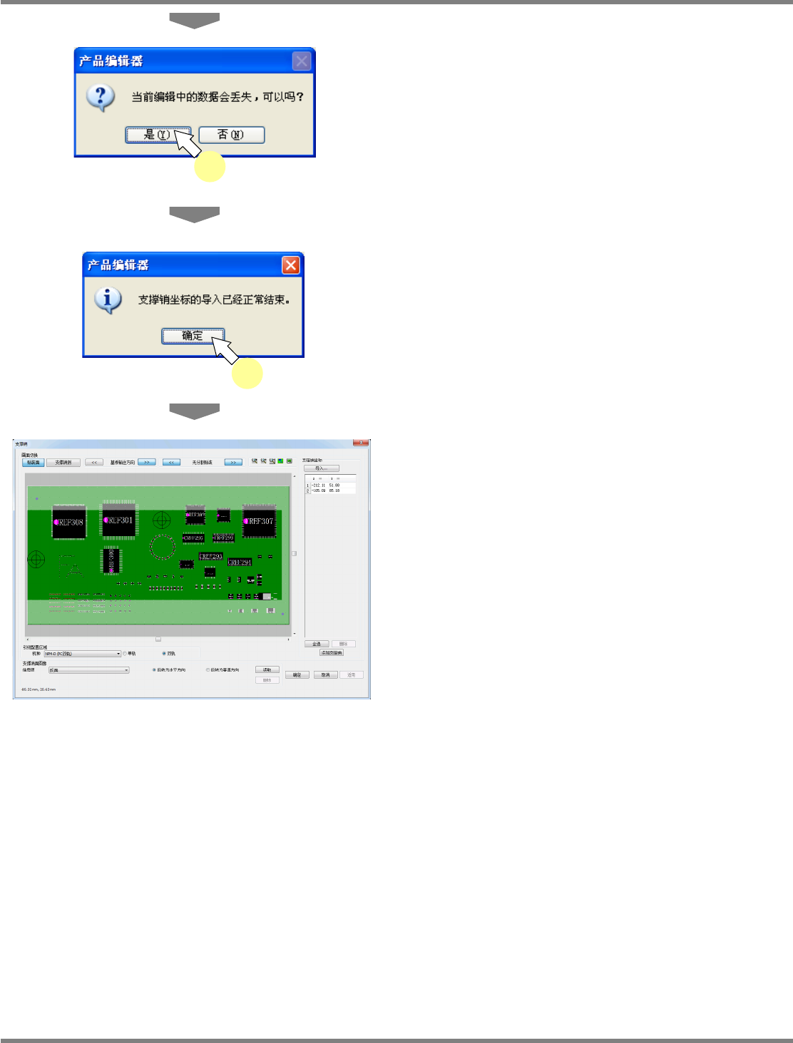 NPM-DGS 程序手册 13.2 支撑销配置数据的编制功能 Page 13-58 EJS9AC-MB-13P-24 5 替换支撑销的坐标时,点击 [ 是 ] 。 6 将会显示导入结束的信息, 点击 [ 确定 ] 。 导入后的支撑销数据,将会显示在基 板上以及 支撑销坐标一览中。 当使用以往版本的数据时,有时坐标 数据会被 修改。 导入后,请确认是否会发生干涉。 Howto130205S-2 4C01 Howto130205S-…