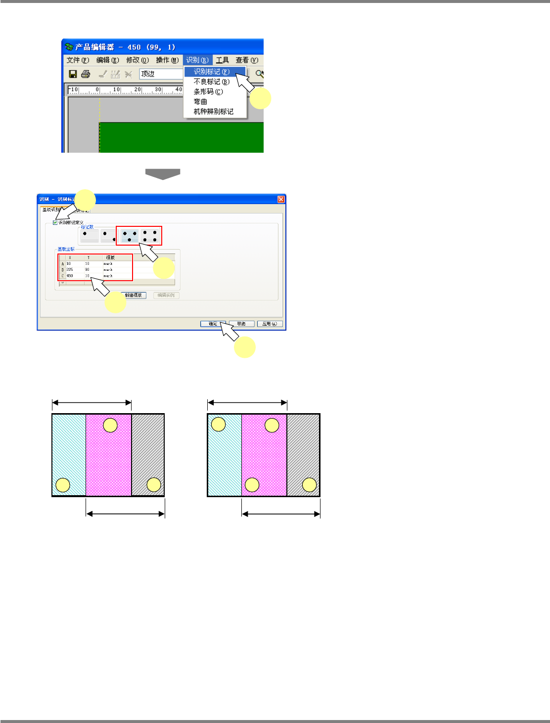NPM-DGS 程序手册 13.3 大基板的贴装 EJS9AC-MB-13P-24 Page 13-75 识别标记的设定 (PCB 编辑器 ) 1 在 PCB 编辑器下,选择菜单栏的 [ 识 别 ] [ 识别标记 ] 。 2 勾选基板识别标记选项的 ‘ 识别标记定 义 ’ 。 3 选择 3 点或 4 点的标记数量。 4 考虑生产线上的设备, 在能够应用分割 贴装区域的范围内设定识别标记。 ( 図 1 、 2 为 NPM-D 的示…