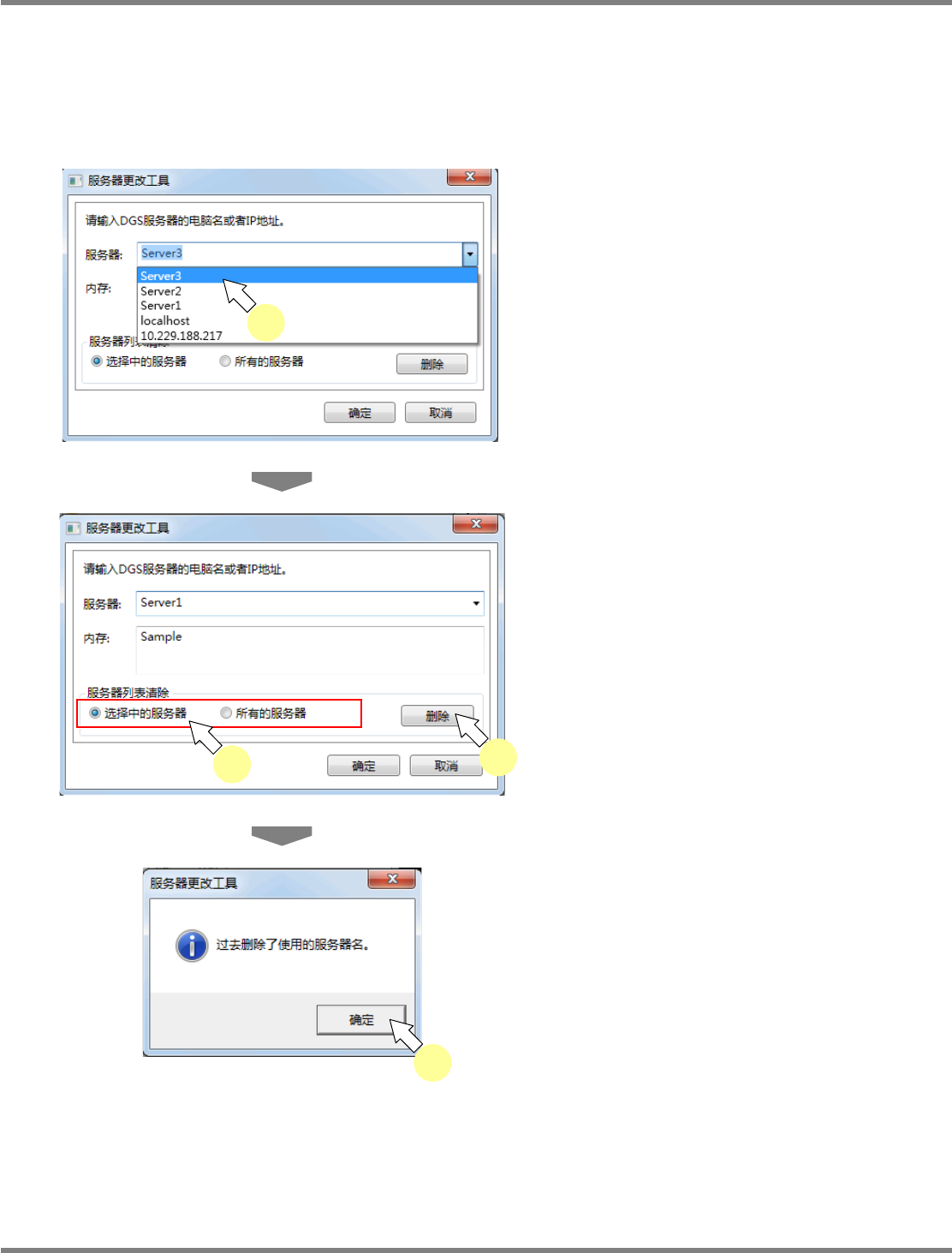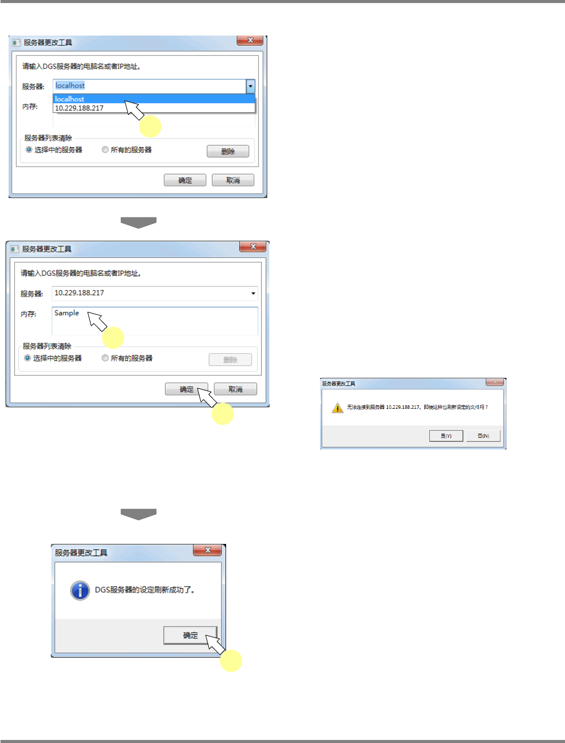 NPM-DGS 程序手册 13.7 服务器更改工具 Page 13-118 EJS9AC-MB-13P-24 选择服务器/电脑名后更改时 1 从下拉菜单中选择服务器。 将显示以往更改过的服务器列表。 ( 最多 20 项 ) 2 输入注释。 请以任意文字输入与连接处服务器相 关的注 释。 3 点击 [ 确定 ] 。 当无法连接服务器时,将显示以下的 错误对话 框。 更新设定时 : [ 是 ] 重新输入时 : [ 否 ] 4…