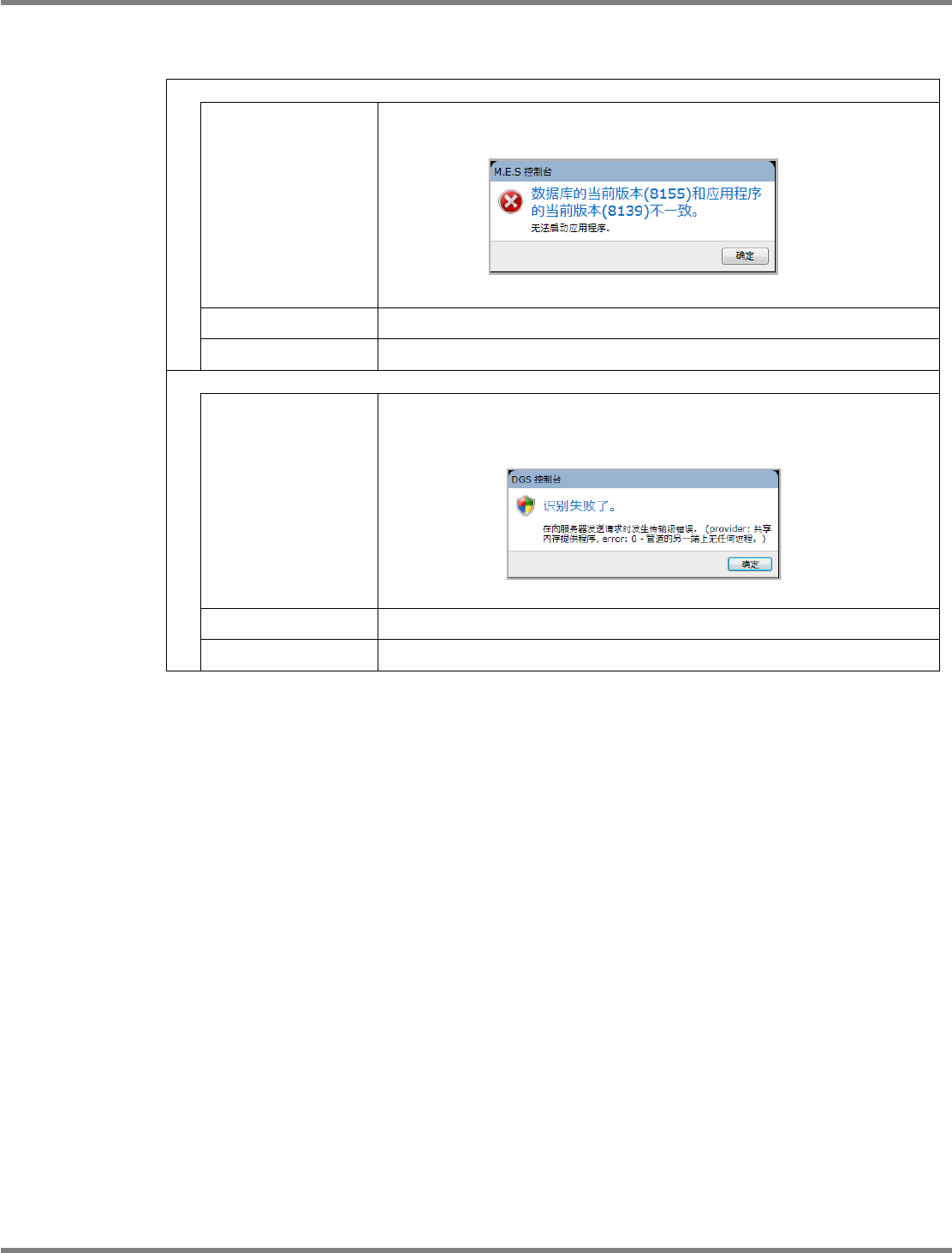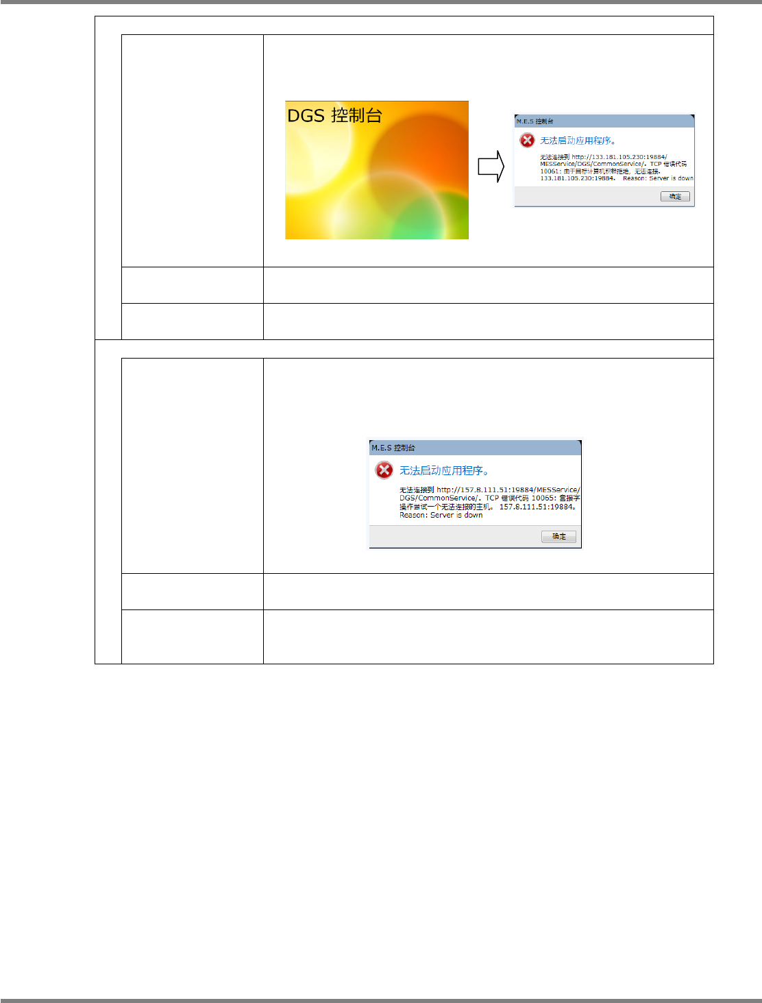 NPM-DGS 程序手册 14.1 故障排除 Page 14-6 EJS9AC-MB-14P-05 现象 : 在服务器客户端系统下, DGS 控制台画面显示超出 10 分钟,并无法启动应用程序。 错误信息 “ 无法连接到 http://(IP 地址 ):19884/MESService/DGS /CommomService/ 。 TCP 错误代码 10060 / 10061 : 由于目标计算机积 极拒绝,无法连接。 (IP 地址 ):1…
