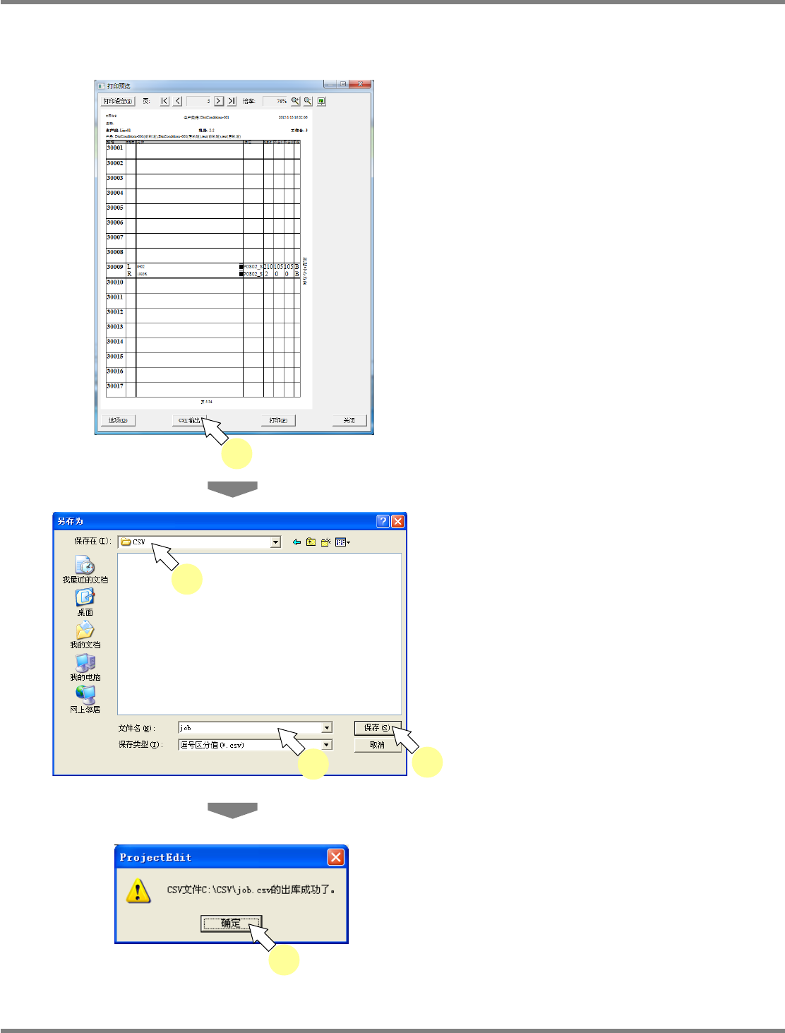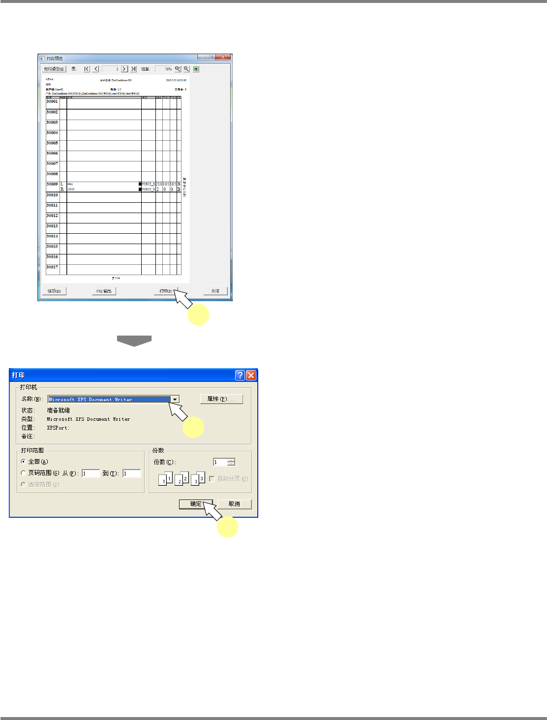 NPM-DGS 程序手册 7.2 项目编辑系统主画面 Page 7-60 EJS9AC-MB-07P-29 打印 在打印预览画面上打印。 1 点击 [ 打印 ] 。 显示出 < 打印 > 画面。 2 进行印刷所需的设定。 3 点击 [ 确定 ] 。 将在所选择打印机上开始印刷帐票。 根据帐票的内容,打印各工作台的供 料器和吸 嘴的配置。 Product070206S- 07C00 2 3 Product070…
