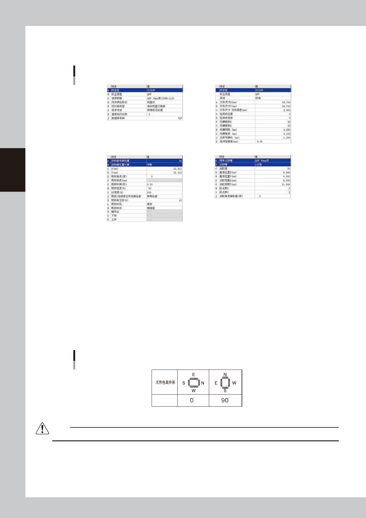 吸附角度参数会影响识别基准与贴装角度。必须注意元件包装外形横方向长时的 0 度与 180 度,竖方向长时的 90 度与 -90 度的区别。