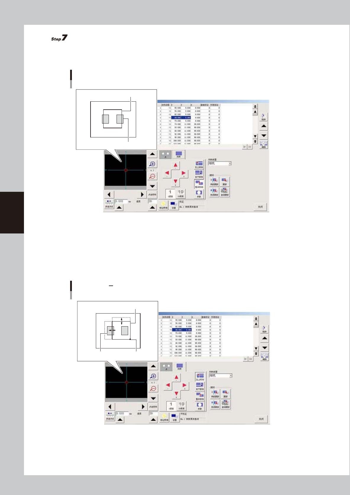1. 视觉显示屏有十字导线。红框为示教窗口。使用 [ 左上移动 ]、[ 右下移动 ]、[ 整体移动 ] 按钮,调节