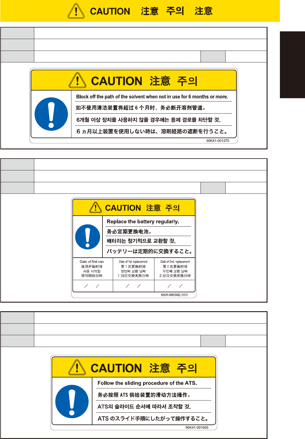 xxi 安 全 须 知 危 险 结 果 有 损 坏 机 器 的 危 险 。 安 全 防 范 如 果 不 使 用 清 洁 装 置 将 超 过 6 个 月 时 , 为 保 护 溶 剂 泵 , 务 必 断 开 溶 剂 管 道 。 对 象 印 刷 机 所 有 机 型 警 告 阶 段 维 修 保 养 危 险 结 果 可 能 会 损 坏 功 能 。 安 全 防 范 电 池 有 使 用 寿 命 , 务 必 定 期 更 换 。 对 象 配 备 UP S…
