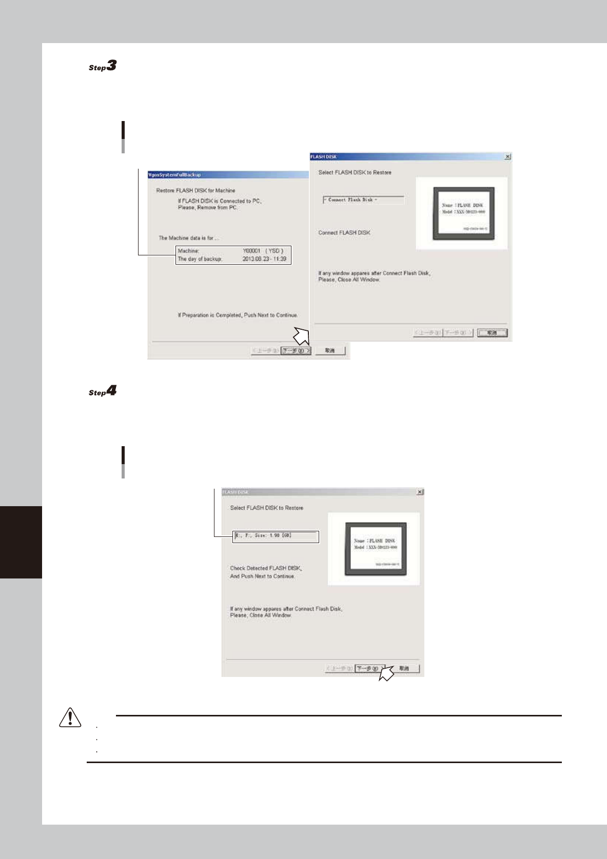 6-16 6 数 据 的 管 理 进 行 还 原 。 显 示 “ V g o s S y s t e m F u l l B a c k u p ” 对 话 框 , 确 认 显 示 的 是 想 要 还 原 的 对 象 机 器 后 , 点 击 [ 下 一 步 ( N ) ] 按 钮 , 显 示 “ F L A S H D I S K ” 对 话 框 。 确认对象机器 确认 66 61 6 -N 7- 00 连 接 闪 盘 。 将 …