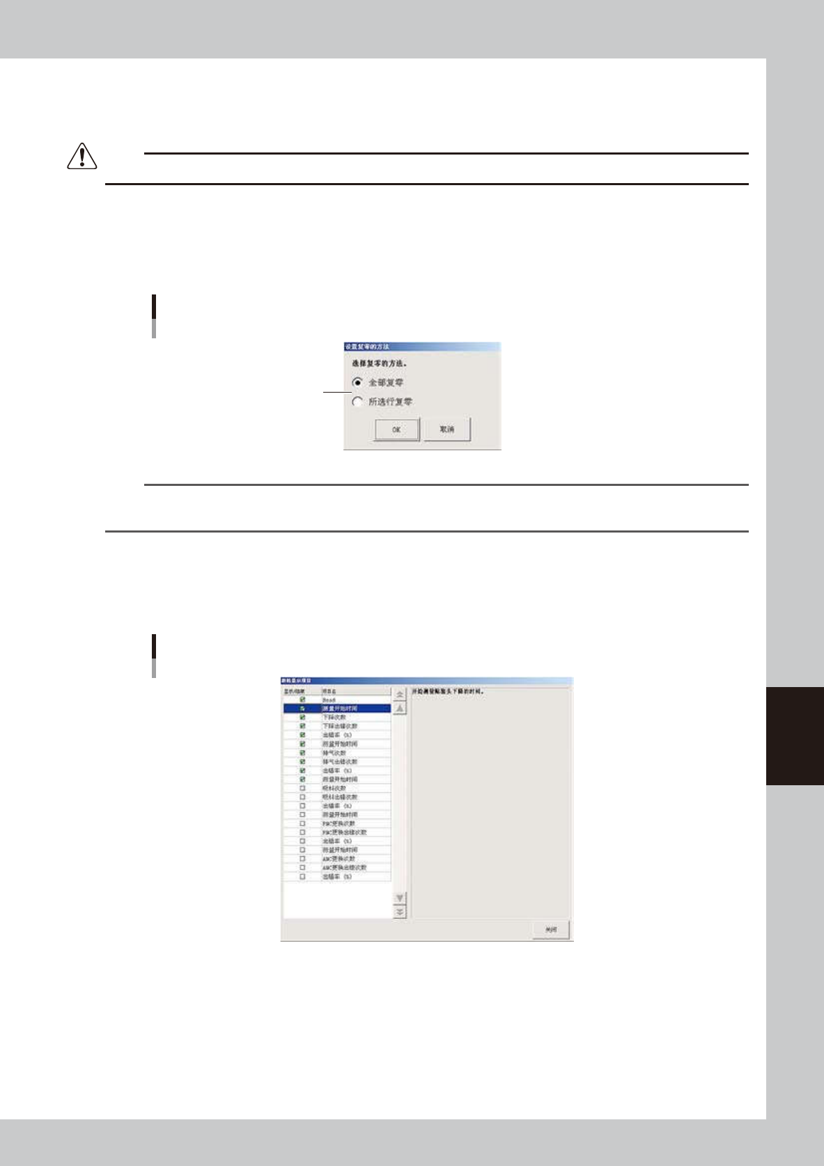6-25 6 数 据 的 管 理 [ 清 除 ] 按 钮 ( 此 按 钮 只 在 履 历 画 面 中 显 示 ) 可 以 清 除 当 前 正 在 显 示 的 视 窗 中 所 有 履 历 数 据 。 但 不 能 以 行 为 单 位 清 除 数 据 。  显 示 确 认 清 除 的 对 话 框 , 按 [ 是 ] 按 钮 。 注意 被清除的数据无法复原。 [ 复 零 ] 按 钮 ( 此 按 钮 只 在 履 历 2 画 面 中 显 示 )…