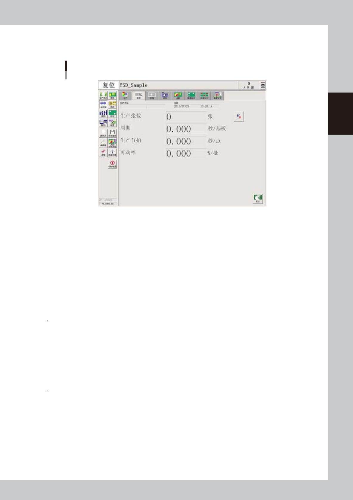 2-26 2 基 本 操 作 4 . 2  生 产 监 控 屏 在 生 产 过 程 中 想 要 确 认 运 行 状 态 时 , 按 [ 监 控 屏 ] 按 钮 。 选 择 “ 生 产 ” 、 “ 全 部 ” 、 “ 详 细 ” 、 “ 视 觉 ” 、 “ 点 胶 ” 、 “ 基 准 标 记 ” 、 “ 坏 板 标 记 ” 选 项 卡 , 可 以 从 中 确 认 与 点 胶 相 关 的 生 产 信 息 。 ■  监 控 屏 : 生 产…