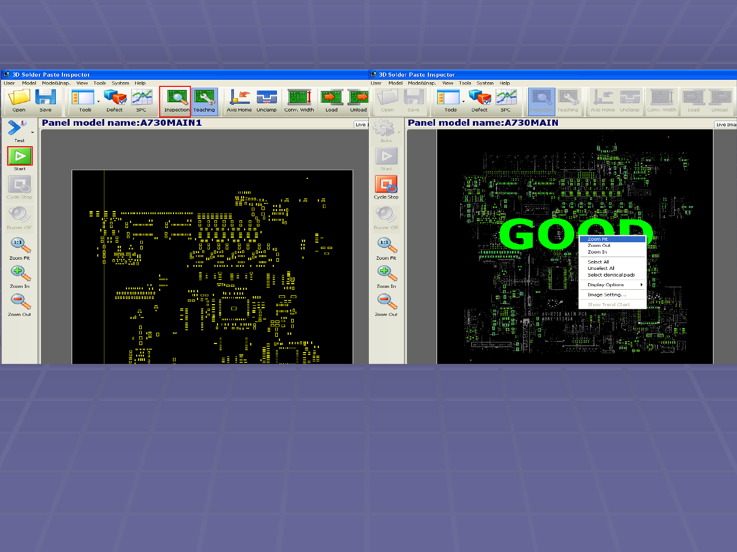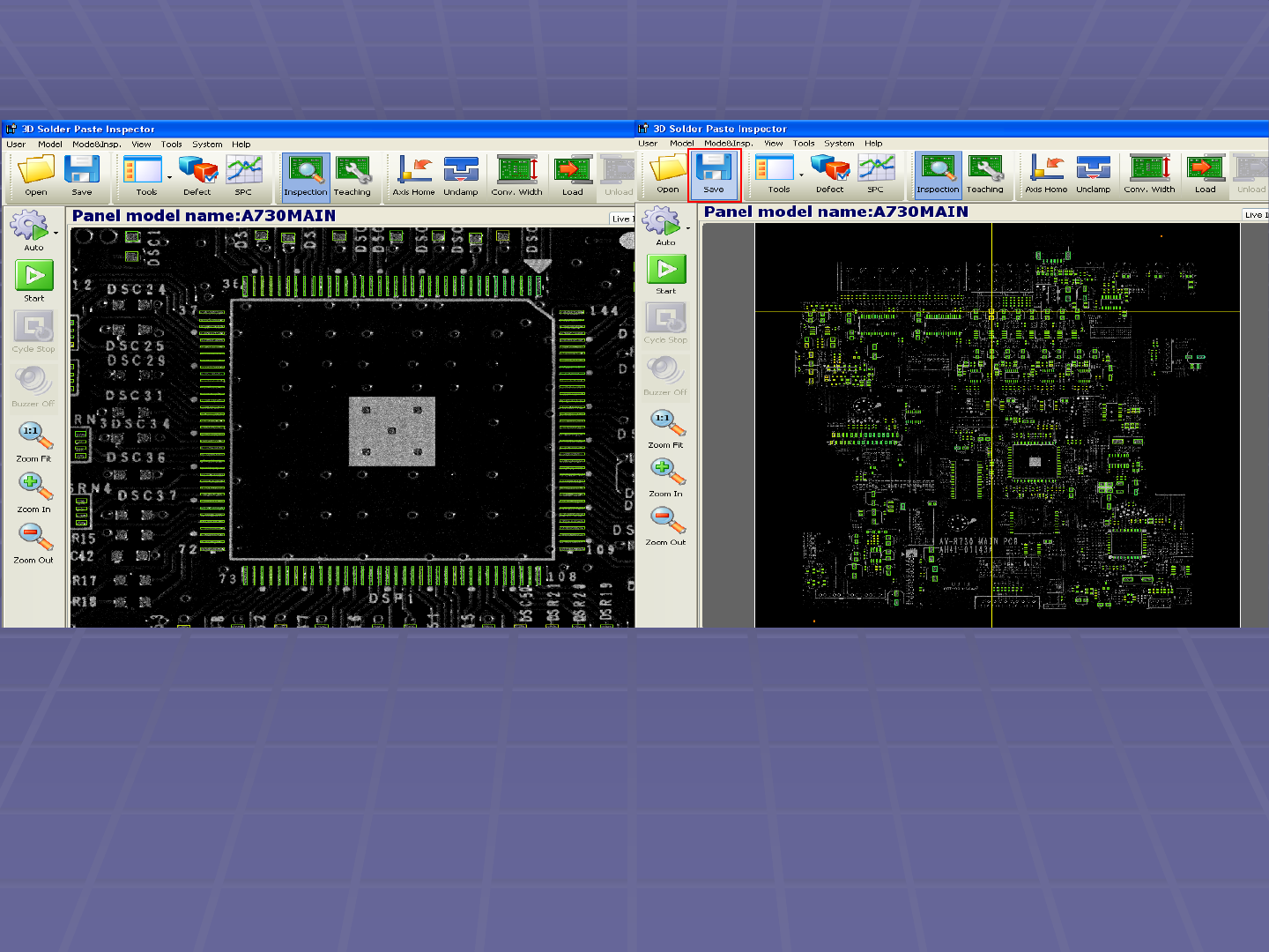 18. 对指定位置进行选择放大 , 观察 Pad 是否正确的框在焊盘上 . 17. 点击 [Save] 保存程序 , 然后依次点击 [Inspection]-[Start], 进行板子的 扫描检查 . OIIIIIO oiiiiio 1 0 D n 1 I II _ 口口 口 11 Illi II II Illi II II I I D I OD I ODD I DO I 00 D model name: A730M AIN Live …