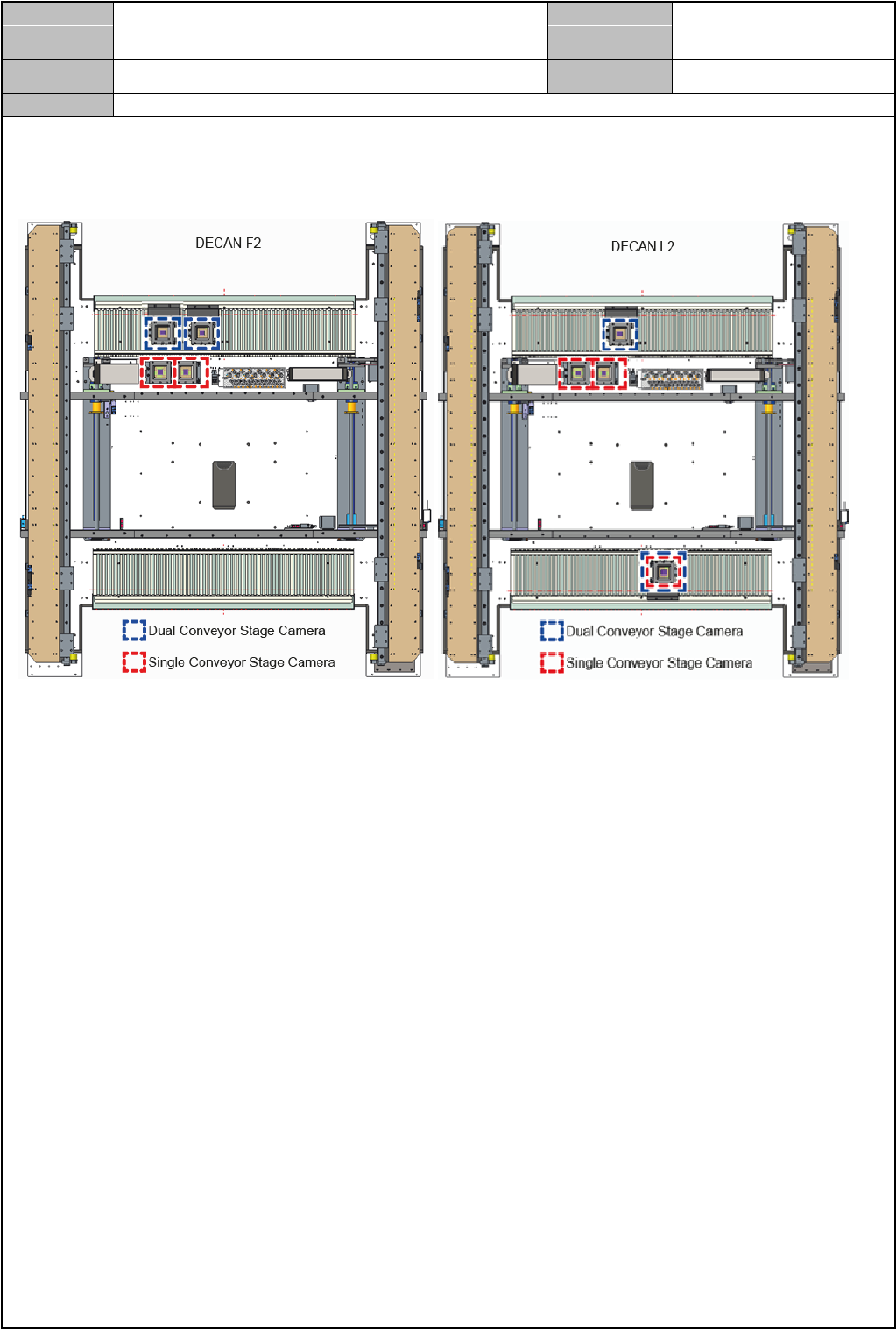 Model DECAN Series Company SAMSUNG TECHWIN Module 1. 设备概述 V ersion 01 Tit le ST AGE CAMERA 安装位置 Page 1-19 Note [ST AGE CAMERA 安装位置 ] DECAN F2 Single Conveyor Lane : - 在后面 Ba se Frame 可安装 2 组 Dual Conveyor Lane : - …