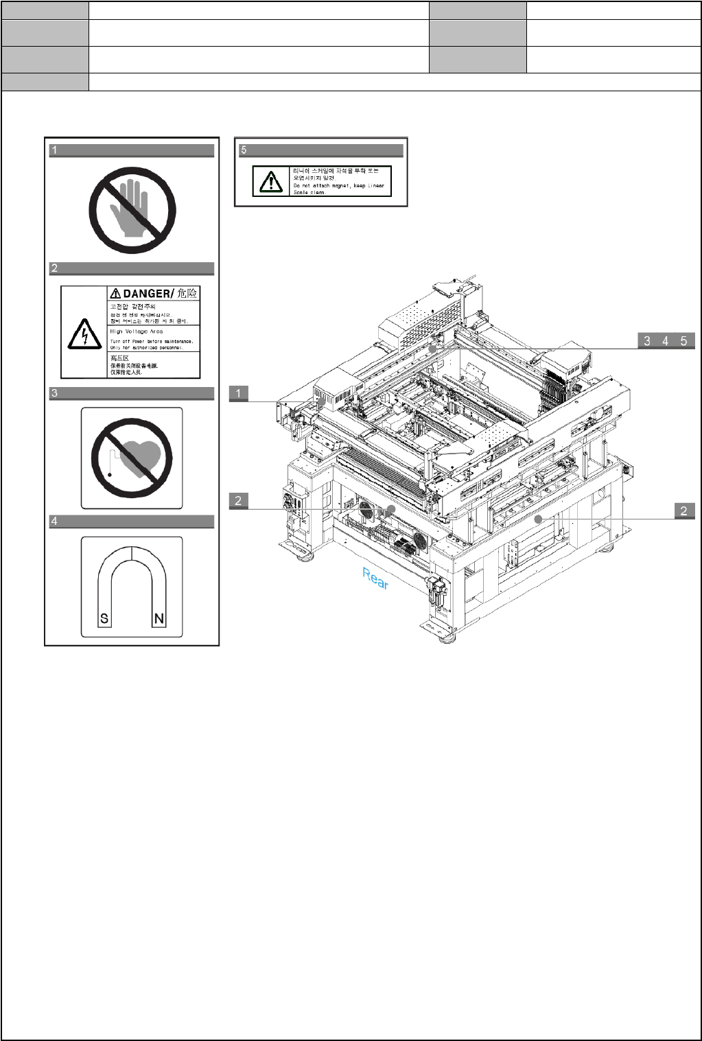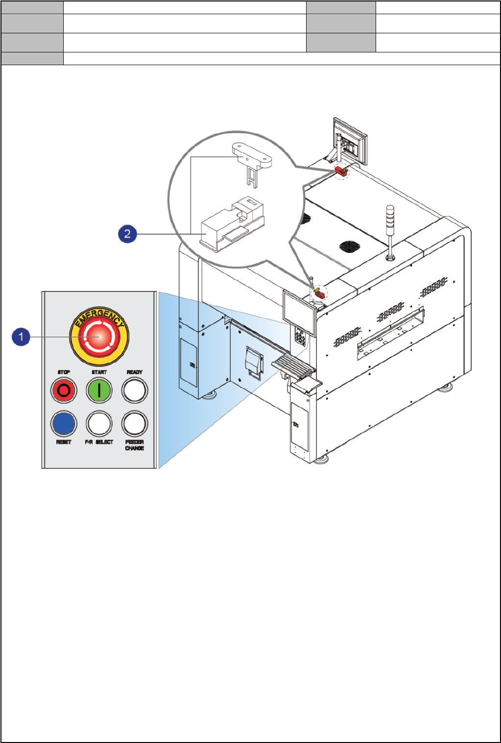 Model DECAN Series Company SAMSUNG TECHWIN Module 1. 设备概述 V ersion 01 Tit le 维修时注意事项 Page 1-6 Note 安全装置的启动 下面记述紧急情况下及时停止设 备运转或为维修方便操作的安全装置 的启动。 ① Emergency Switch ② Door Lock Switch 1) EMG (Emergency Stop) 开关 紧急停止开关。紧急情况…