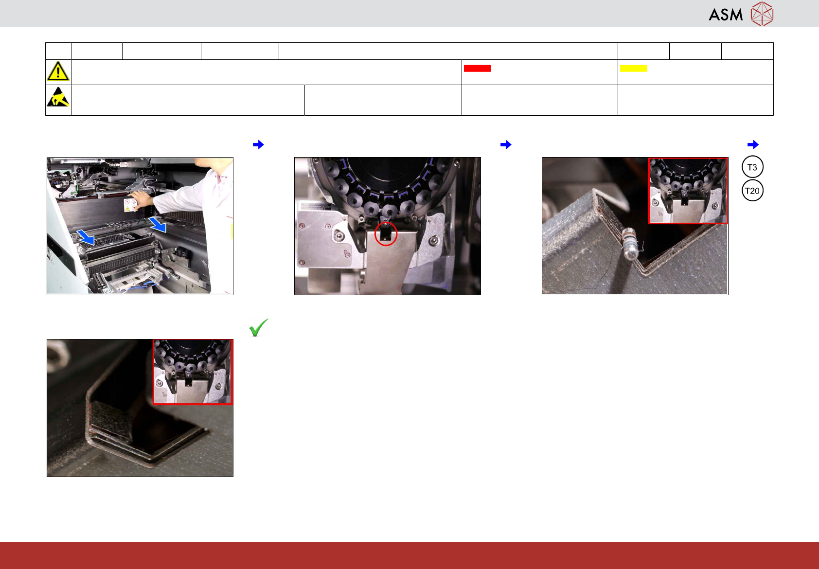 6 WF 3 TX 系列 维护 放回已维修好的 CPP 贴片头 8分钟 2 / 2 注 意 开 始 维 护 前 , 请 参 阅 用 户 手 册 中 的 安 全 说 明 贴片机状态 关闭 传送导轨空 注意!遵守防静电守则 工具: T7、T8、T9、T49、T62 易损件: 耗材: www.asm-smt.com 7 连接 3 个压缩空气接头。 8 将 Y 轴移到外部极限上。 9 取下元件传感器上的保护帽。