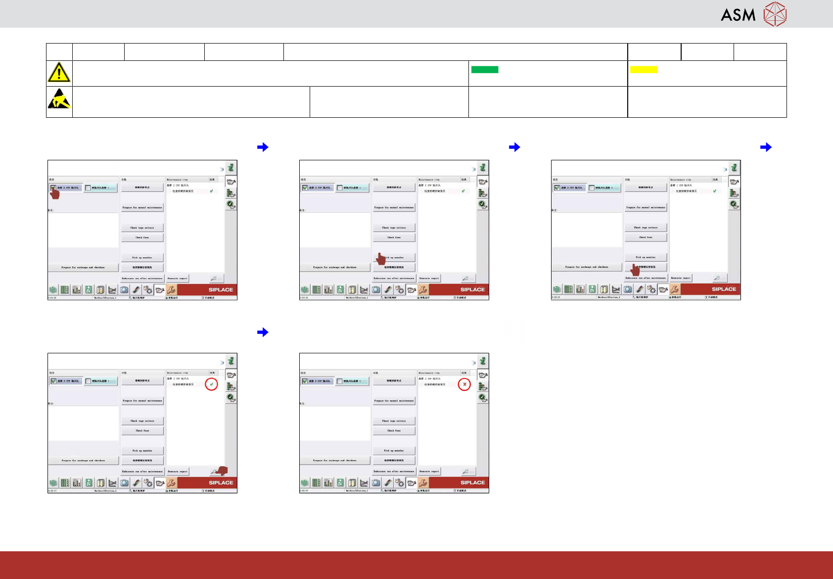 21 WF 3 TX 系列 维护 检查吸嘴座:CPP 和 C&P20 P 2 分钟 1 / 1 注 意 开 始 维 护 前 , 请 参 阅 用 户 手 册 中 的 安 全 说 明 贴片机状态开启 传送导轨空 注意!遵守防静电守则 工具: 易损件: 耗材: www.asm-smt.com 1 选择所有 CPP 或 C&P20 P 贴片头。 2 点击“拾取吸嘴”图标。 3 点击“检查吸嘴座”图标。 4 检查结果是否正常(…