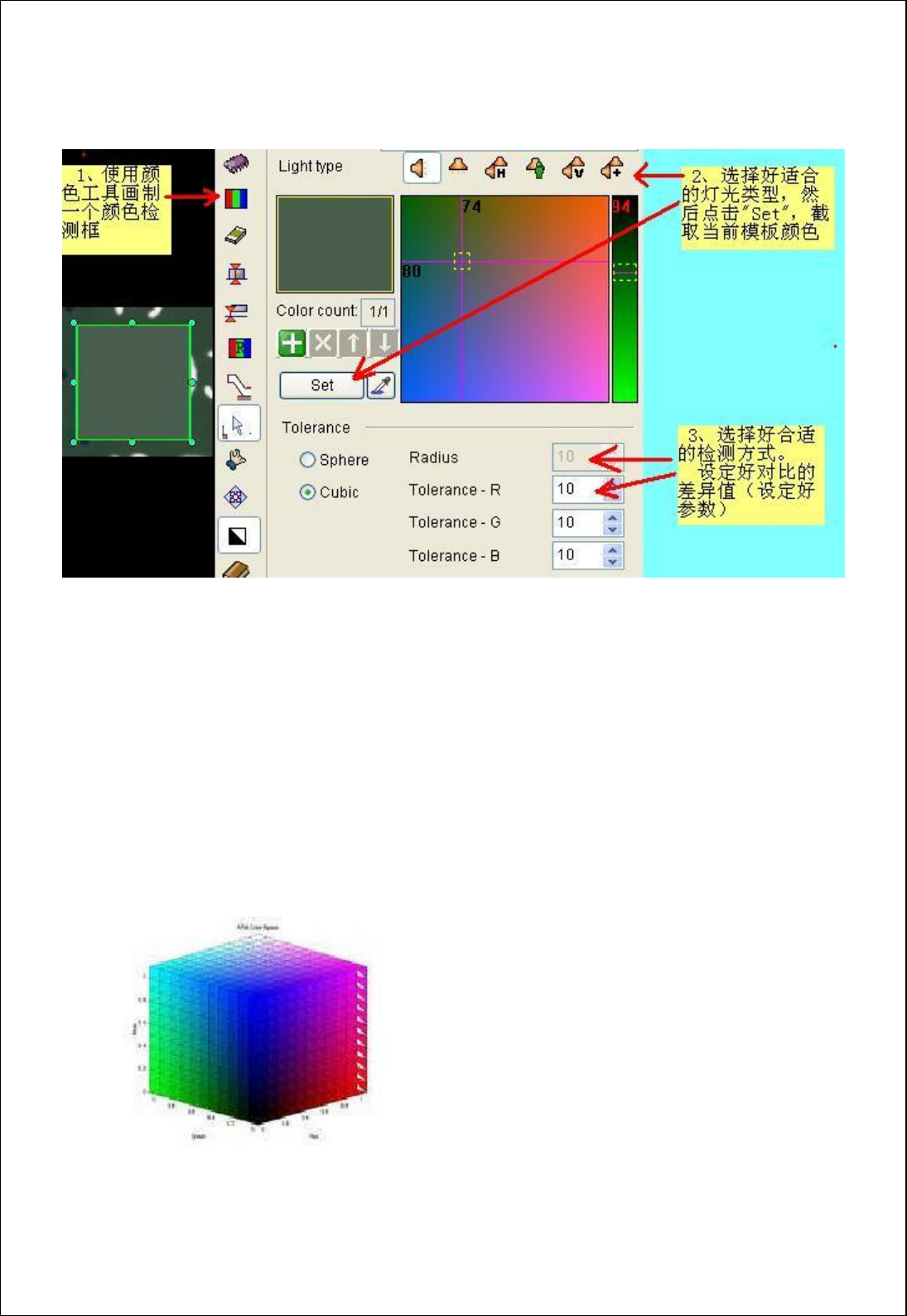 颜色编程步骤:(见上图标示)
