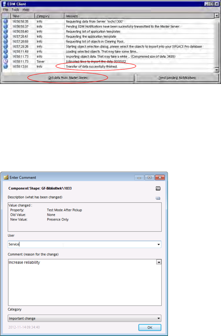 The comment dialog box opens if you make changes in SIPLACE Pro on the Line Server (e.g. if