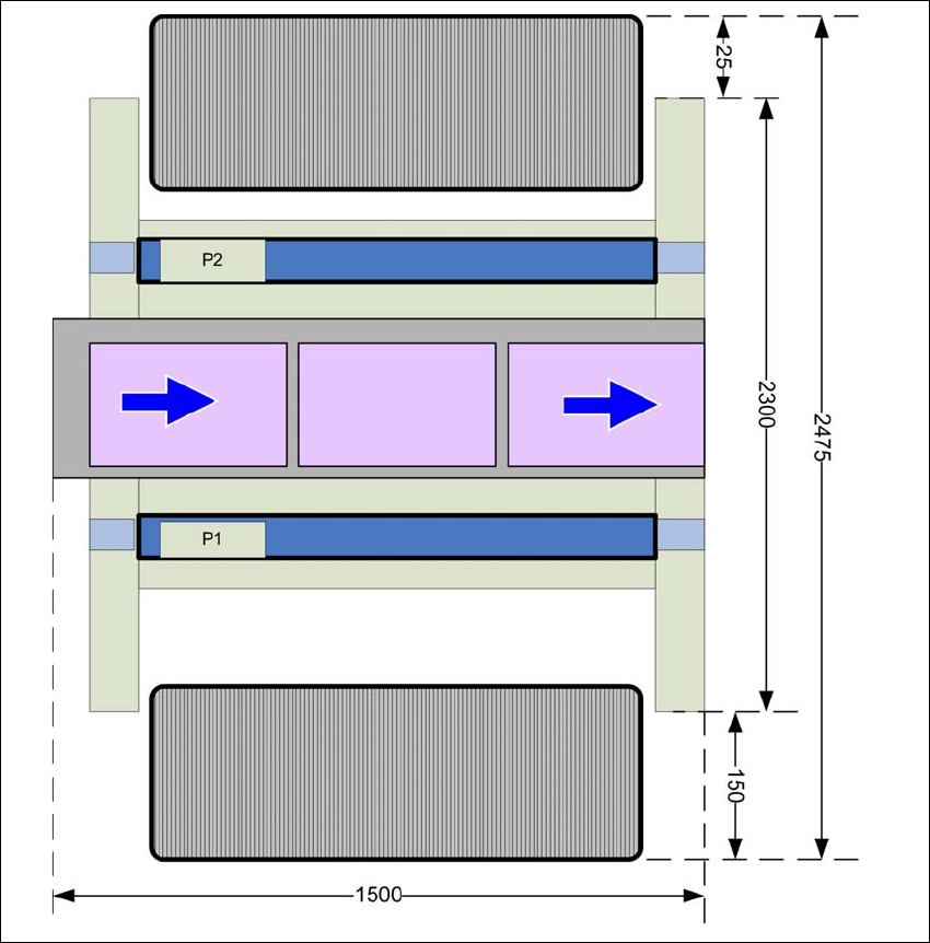 c) 표준 구성 : 안쪽에 컴포넌트 트롤리 1 개 , 바깥쪽에 컴포넌트 트롤리 1 개 및 단일 컨베이어