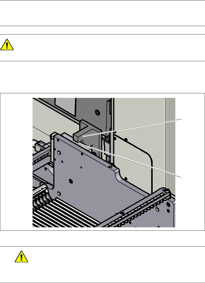 → 컴포넌트 트롤리를 조심스럽게 장비 끝까지 밀어넣습니다 . 전환 테이블의 정지 블록 (2) 는