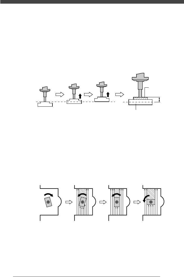 3- 90 SER04989020 調整 第 3 章 3 3.3.1 レーザー認識に関して レーザーで部品認識する場合、部品情報に入力されている「モールド認識高さ」 分ノズルが上昇してスキャンを行います。 補助調整の「部品吸着」 ・ 「適正検索」コマンドを実行すると、部品吸着したノズ ルが上昇し、モールド認識高さに達すると回転させて WX, WY を検出します。 検出方法は下記の通りです。 ・モールド認識高さの検出 20443322-0…