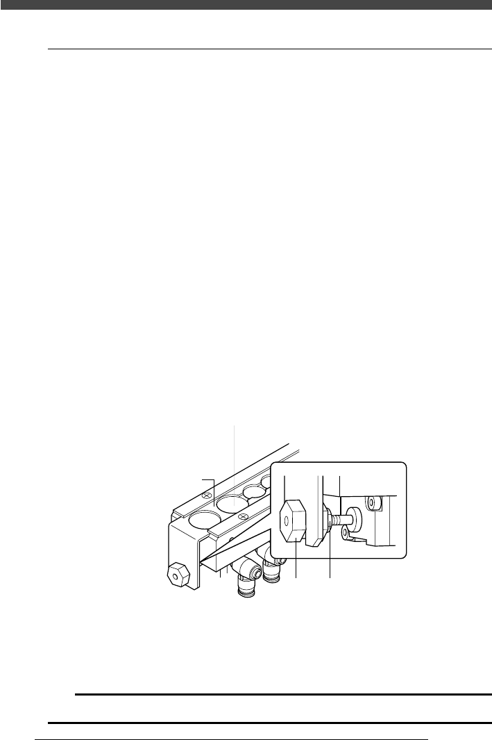 3- 171 SER04989020 調整 第 3 章 8 8 . ノズルステーション 自動ノズル交換用のノズルステーションには、標準用 7 個、オプション用 9 個 の計 1 6 個のノズルを保持することができます。ノズル交換がスムーズに行える ように下記の項目を調整します。 ノズルステーションの調整項目 ・クランププレート位置調整 ・ノズルセンサーのアンプ調整 ・ノズルステーション座標調整 ■ ノズルステーション 20443800-…