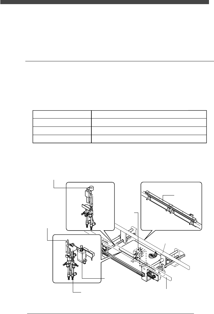 ベアレールに沿って各機構部が配置されており、エア圧によって作動します。こ