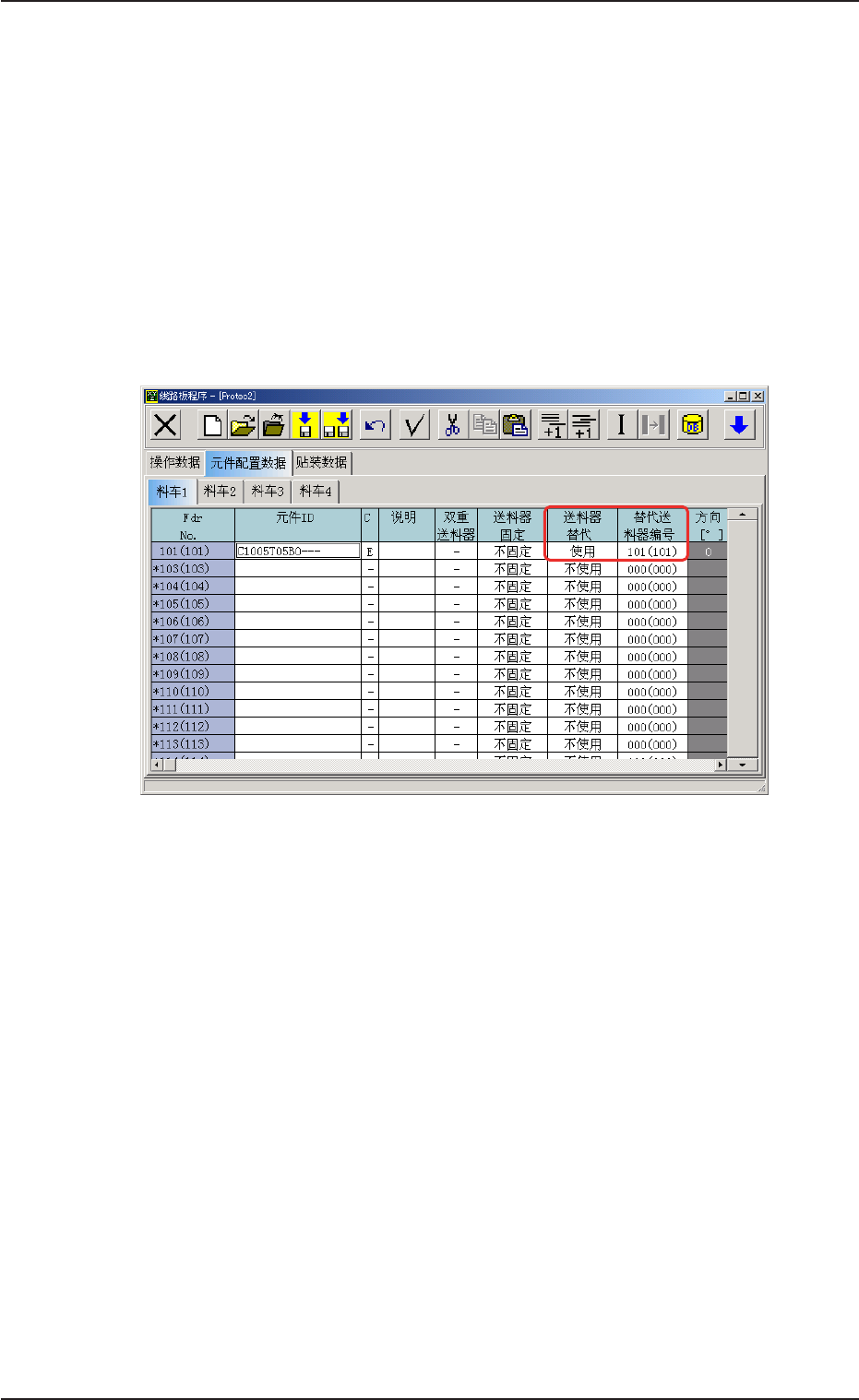 • 原来的送料器编号( 元件配置数据) 的 C(控制指令) 数据被设定为