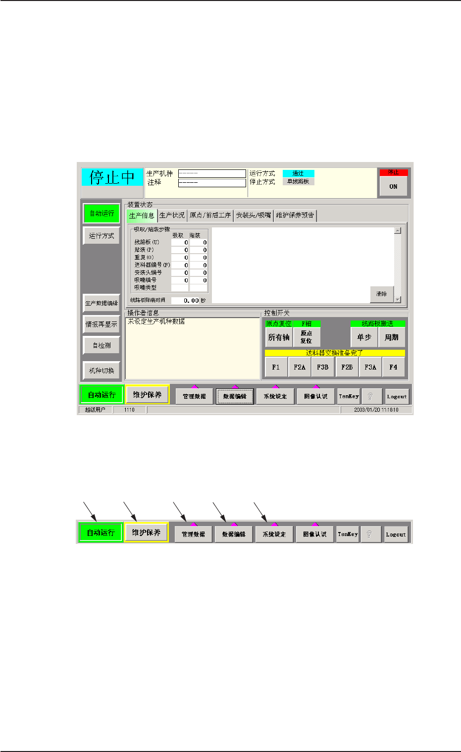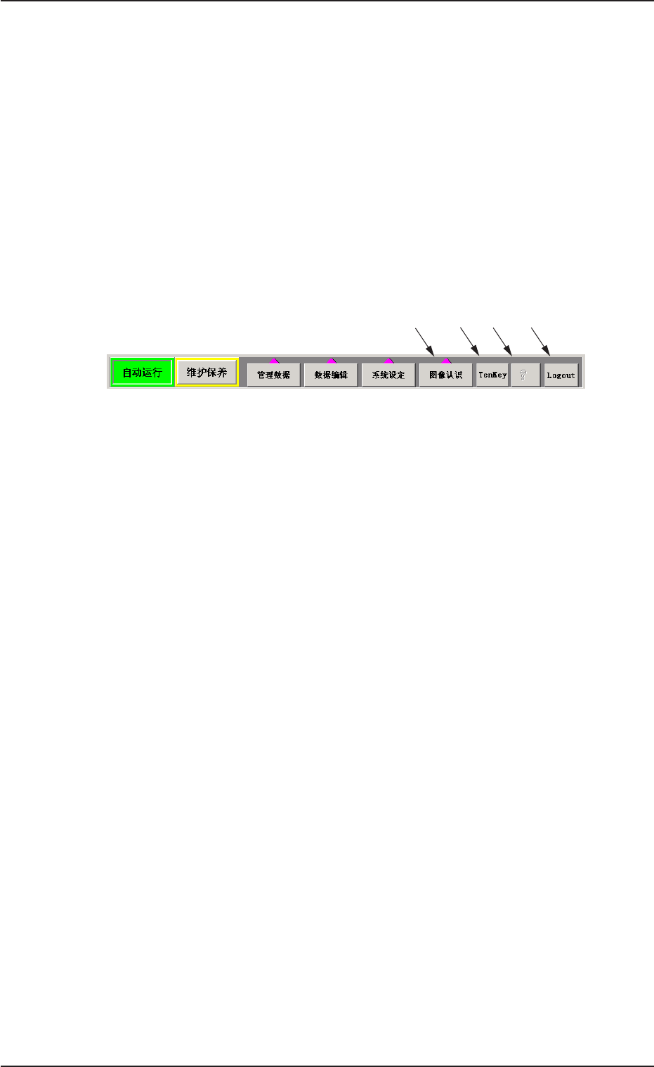 1. 1. 1. 1. 1. 菜单构成 菜单构成 菜单构成 菜单构成 菜单构成 1.1 1.1 1.1 1.1 1.1 主菜单栏 主菜单栏 主菜单栏 主菜单栏 主菜单栏 主菜单栏按照不同的操作目的,可分为 “ 自动运行 ” 、 “ 维护保养 ” 、 “ 管理数据 ” 、 “ 数据编辑 ” 、 “ 系统设定 ” 等 5 大栏, 各栏的选择按 钮排列在触摸屏下端的主菜单栏上。 Fig.2D1 Fig.2D1 Fig.2D1 Fig.2D1 …