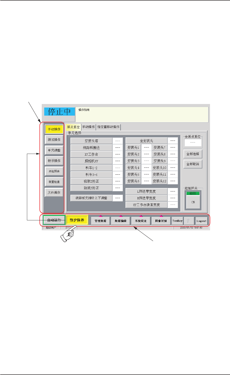 1.2.2 1.2.2 1.2.2 1.2.2 1.2.2 维护保养菜单 维护保养菜单 维护保养菜单 维护保养菜单 维护保养菜单 • • • • • 菜单操作 菜单操作 菜单操作 菜单操作 菜单操作 1. 按主菜单栏中的 [ 维护保养 ] 按钮,便 显示 “ 维护保养 ” 菜单界面 和 “ 维护保养 ” 子菜单栏。 2. 按下排列在 “ 维护保养 ” 子菜单栏中的各子菜单选择按钮,便显 示各子菜单界面。 “ 维护保养 ” 菜单界面包含装…