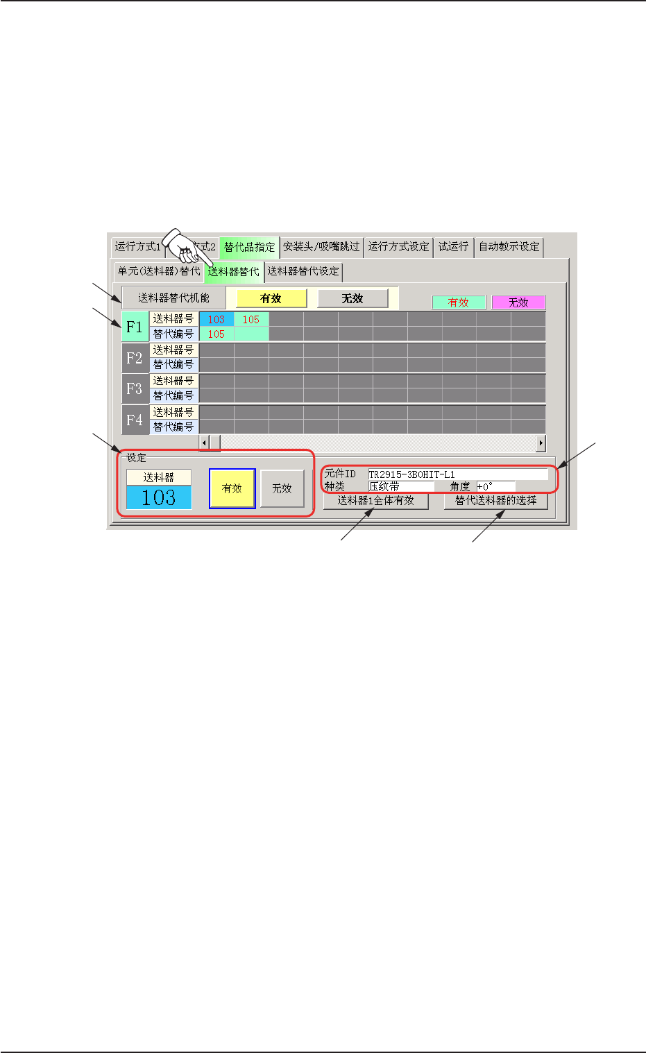 变更送料器替代的 “ 有效 ”/“ 无效 ” 时,按变更的送料器编号后,